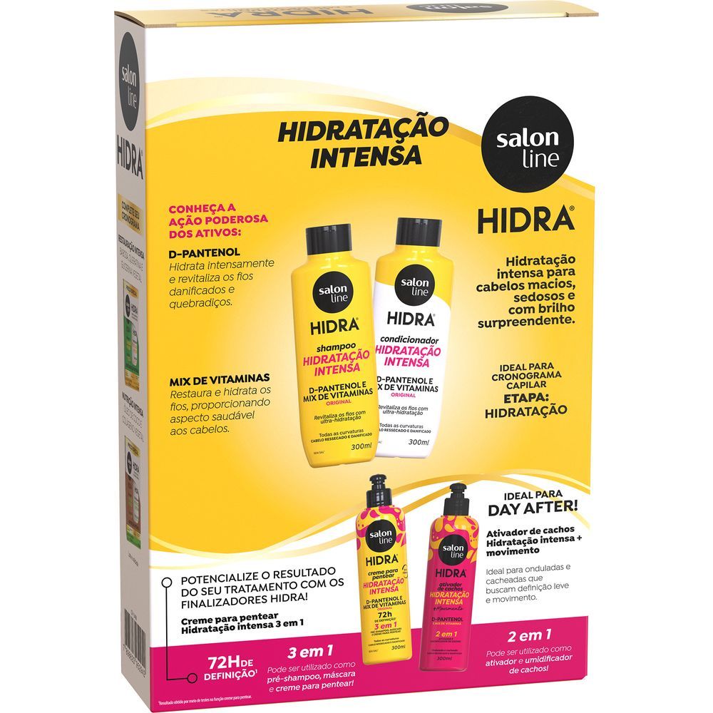 O Kit Shampoo + Condicionador Salon Line Hidra Original 300ml possui fórmula poderosa com ingredientes que agem diretamente nos fios, limpando de forma suave, condicionando e hidratando os cabelos profundamente. Este kit é ideal para quem busca revitalização e saúde para os fios, proporcionando um cabelo macio e radiante. Benefícios: - Hidratação; - Restauração; - Limpeza suave; - Brilho e maciez. Modo de usar: Aplique o shampoo sobre o cabelo úmido, massageie suavemente o couro cabeludo com a ponta dos dedos em movimentos circulares. Enxágue e repita se necessário. Aplique o condicionador no cabelo limpo. Penteie com os dedos, deixe agir por um minuto. Enxágue bem. Sobre a marca: A Salon Line, uma das maiores fabricantes de cosméticos do Brasil, acompanha a evolução da mulher brasileira há mais de 15 anos. Toda essa vivência faz da empresa uma profunda conhecedora do universo feminino. A Salon Line está sempre investindo em novas tecnologias e produtos para oferecer o que há de melhor no segmento cosmético mundial. Empresa 100% Nacional, tem como objetivo especializar-se na beleza das mulheres brasileiras, desenvolvendo produtos de alta tecnologia e valorizando todas as belezas.