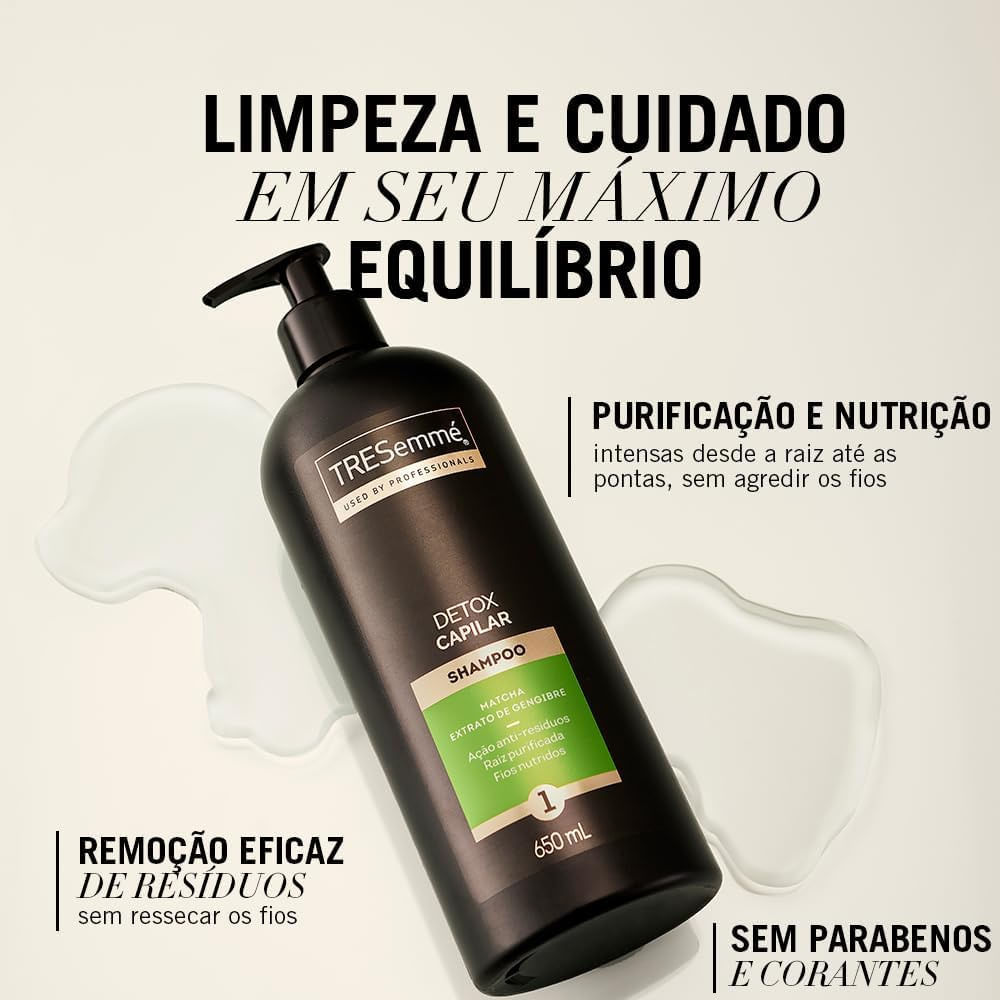O Kit Shampoo + Condicionador Tresemmé Detox Capilar 650ml oferece o equilíbrio perfeito entre detox e nutrição para cabelos limpos, revitalizados e nutridos. Desenvolvido para promover uma limpeza profunda sem ressecar, ele remove resíduos acumulados como poluição, fumaça e suor, deixando os fios purificados e leves. Sua fórmula é enriquecida com Matcha e Extrato de Gengibre, ingredientes que trazem uma sensação refrescante e revigorante, mantendo a raiz saudável e os cabelos livres de impurezas. Sem parabenos e corantes, esse kit é ideal para cabelos normais a oleosos, garantindo uma rotina de cuidado mais natural. Contém no kit: - Shampoo Tresemmé Detox Capilar 650ml - 1 Unidade. - Condicionador Tresemmé Detox Capilar 650ml - 1 Unidade. Benefícios: - Limpeza Profunda e Eficaz: Remove resíduos indesejados sem agredir os fios, promovendo uma purificação completa dos cabelos. - Sensação Revigorante: Proporciona uma sensação de frescor na raiz, mantendo-a limpa e saudável. - Nutrição Intensa: Fortalece os fios com ingredientes nutritivos, deixando os cabelos mais saudáveis e resistentes. - Fórmula Sem Parabenos e Corantes: Ideal para quem busca um cuidado capilar mais natural e leve. Modo de usar: - Shampoo: Aplique o shampoo nos cabelos molhados, massageando suavemente o couro cabeludo para remover as impurezas. Enxágue bem. Se necessário, repita o processo. - Condicionador: Em seguida, aplique o condicionador no comprimento e nas pontas dos fios. Deixe agir por alguns minutos para hidratação profunda e enxágue completamente. Sobre a marca: A marca TRESemmé foi criada em 1947 pela cabeleireira Edna L. Emme, que teve a ideia de trazer a qualidade dos produtos profissionais dos salões para as mulheres em casa. A marca foi desenvolvida inicialmente para cabelos fortes e lisos. A TRESemmé é uma marca da Unilever, que adquiriu a empresa em 2010. A marca é inspirada nos valores de independência, autossuficiência e confiança, que a fundadora Edna L. Emme acreditava serem importantes para as mulheres.