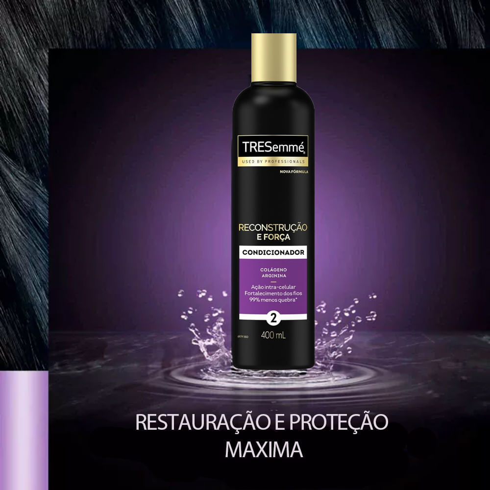 TRESemmé Reconstrução e Força reduz 99% da quebra dos fios desde o primeiro uso, deixando seus cabelos mais fortes e resistentes. - Foi profissionalmente desenvolvido com Fórmula Micelar que, por meio de moléculas inteligentes, remove as impurezas de maneira delicada e eficaz, sem danificar os fios. - Sua fórmula é enriquecida com Proteína, Colágeno e Aminoácidos que compõe a estrutura natural do cabelo. - A linha TRESemmé Reconstrução e Força é ideal para quem deseja recuperar a força dos fios que foram danificados por processos químicos.