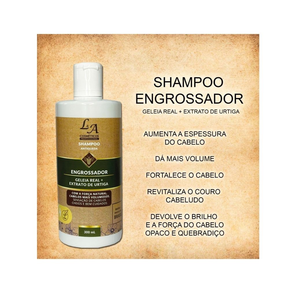Conteudo :Kit Shampoo e condicionador Antiqueda Engrossador 2x300ml O Kit antiqueda engrossador é indicados para cabelos finos e frageis , formulado para reduzir a queda capilar , ele oferece maior volume e uma textura mais densa , fortalecida e saudavel . Com a combinação de geleia real e extrato de urtiga , seus ingredientes atuam desde a raiz , promovendo fios mais fortes e resistentes . Benefícios: - Proporciona um aumento na espessura dos fios, fortalece e revitaliza o couro cabeludo; - Além disso, devolve o brilho e a força dos cabelos opacos e quebradiços. Modo de usar: 1) Aplique sobre o cabelo molhado, distribuindo generosamente, fazendo uma leve massagem no couro cabeludo; 2) Enxágue e repita a operação.