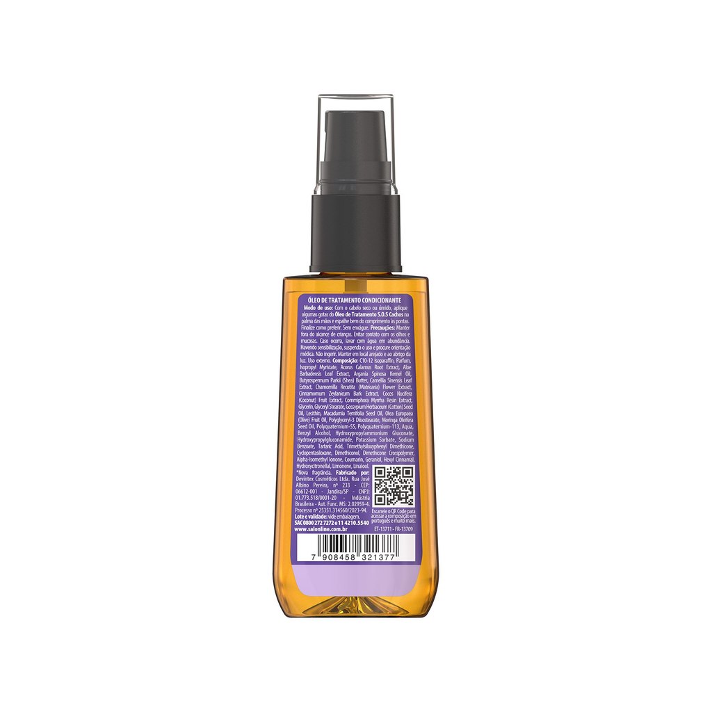 O kit contém 1 Shampoo 300ml e 1 Condicionador 200ml SOS Cachos Super Óleos e 1 Óleo de Tratamento SOS Cachos Super Óleos 42ml, a combinação ideal para limpar, desembaraçar e nutrir profundamente os fios, garantindo brilho, maciez, força e definição desde a raiz até as pontas. <>INDICAÇÕES$& Para quais tipos de cabelo? Para cabelos cacheados e crespos. Qual a indicação? desnutrido, sem brilho, sem definição, poroso e com pontas duplas. Pode usar a partir de quantos anos? A partir de 12 anos. <>ATIVOS$& Quais os principais ativos? Kit Shampoo 300ml + Condicionador 200ml e Óleo de Tratamento SOS Cachos Super Óleos A combinação entre os óleos de Coco, Argan, Karité, Macadâmia, Oliva, além de outras sementes, ervas e frutos, promove ação nutritiva, pois atua nas camadas mais profundas das fibras capilares, repondo seus nutrientes, garantindo brilho e vitalidade. <>MODO DE USO$& Qual a melhor forma de usar? Kit Shampoo 300ml + Condicionador 200ml SOS Cachos Super Óleos Shampoo S.O.S Cachos Super Óleos Aplique o shampoo no cabelo úmido, massageie e enxágue. Se necessário, repita a aplicação. Condicionador S.O.S Cachos Super Óleos Aplique o produto no cabelo úmido e espalhe uniformemente. Deixe agir entre 1 e 3 minutos. Enxágue bem por toda a extensão dos fios. Óleo de Tratamento SOS Cachos Super Óleos Com o cabelo seco ou úmido, aplique algumas gotas do Óleo de Tratamento S.O.S Cachos Salon Line na palma das mãos e espalhe bem do comprimento às pontas dos fios. Finalize como preferir. Sem enxágue. <>CARACTERÍSTICAS$& É produto vegano? Os produtos são veganos. É liberado? Nenhum dos produtos são liberados.