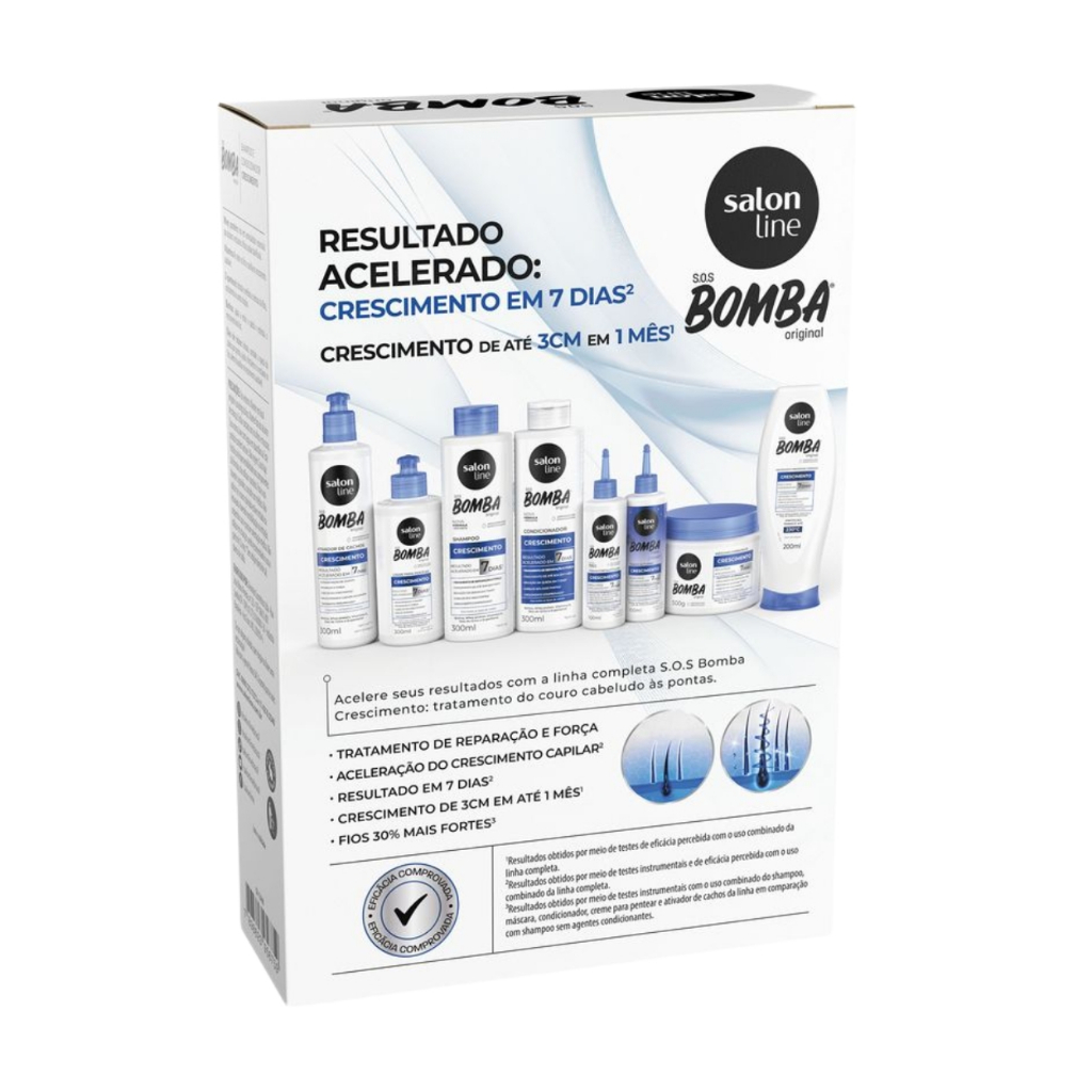 Oii, é um prazer ter você aqui! Quer acelerar o crescimento dos seus cabelos de forma rápida e eficaz? O Kit Capilar SOS Bomba Crescimento Fortalecedor Salon Line é perfeito para quem busca cabelos mais longos, fortes e saudáveis, com um cuidado completo para o dia a dia. O que é: - Kit Capilar SOS Bomba Crescimento Fortalecedor Salon Line. - Sem sal. - Não testado em animais. - 1 Shampoo 200ml. - 1 Condicionador 200ml. O que tem: - Whey protein. - Vitamina A. - D-pantenol. - Biotina. O que ela faz: - Restauração. - Fortalecimento. - Auxilia no crescimento. - Hidratação. - Combate pontas duplas. - Ajuda a prevenir a queda. - Estimula o crescimento. Indicado para: - Todos os tipos de cabelos. - Todas as curvaturas. - A partir de 12 anos. Como usar: Shampoo: - Aplique uniformemente o Shampoo S.O.S Bomba Original no cabelo molhado. - Massageie a raiz até formar espuma. - Enxágue. Condicionador: - Depois de lavar o cabelo com o shampoo, aplique o Condicionador no comprimento e nas pontas. - Deixe agir entre 1 e 3 minutos. - Enxágue. Precauções: - Evite contato com olhos e mucosas. - Não usar se o couro cabeludo estiver irritado ou ferido. - Não ingerir. Com o Kit Capilar SOS Bomba Crescimento Fortalecedor Salon Line, seus cabelos crescem mais fortes, hidratados e cheios de vida. Experimente agora e acelere o crescimento dos seus fios com resultados incríveis! Surgiu alguma dúvida? Entre em contato com a gente! Boas Compras :)