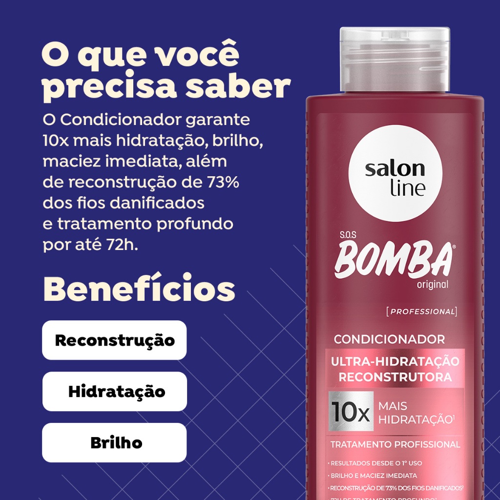 O kit conta com um Shampoo e Condicionador SOS Bomba Ultra-Hidratação Reconstrutora. Esse kit garante limpeza e 10x mais hidratação, brilho e maciez. <>INDICAÇÕES$& Para quais tipos de cabelo? Todos os tipos de cabelos. Qual a indicação? Cabelos ressecados e danificados. Pode usar a partir de quantos anos? A partir de 12 anos. <>ATIVOS$& Quais os principais ativos? Shampoo e Condicionador SOS Bomba Ultra-Hidratação Ácido hialurônico: hidrata e preenche os fios, auxiliando no combate ao ressecamento e frizz. Niacinamida: poderoso antioxidante que nutre e hidrata intensamente. Queratina vegetal: excelente ativo para a reconstrução capilar, promovendo a restauração dos fios danificados. <>MODO DE USO$& Qual a melhor forma de usar? Shampoo SOS Bomba Ultra-Hidratação Reconstrutora Aplique o Shampoo uniformemente no cabelo molhado. Massageie a raiz até formar espuma. Enxágue e, se necessário, reaplique o produto. Para melhores resultados, utilize a linha completa. Condicionador SOS Bomba Ultra-Hidratação Reconstrutora Depois de lavar os cabelos, aplique o Condicionador do comprimento até as pontas. Deixe agir de 1 a 3 minutos e enxágue. <>CARACTERÍSTICAS$& É produto vegano? Todos são veganos. É liberado? Nenhum dos produtos são liberados.