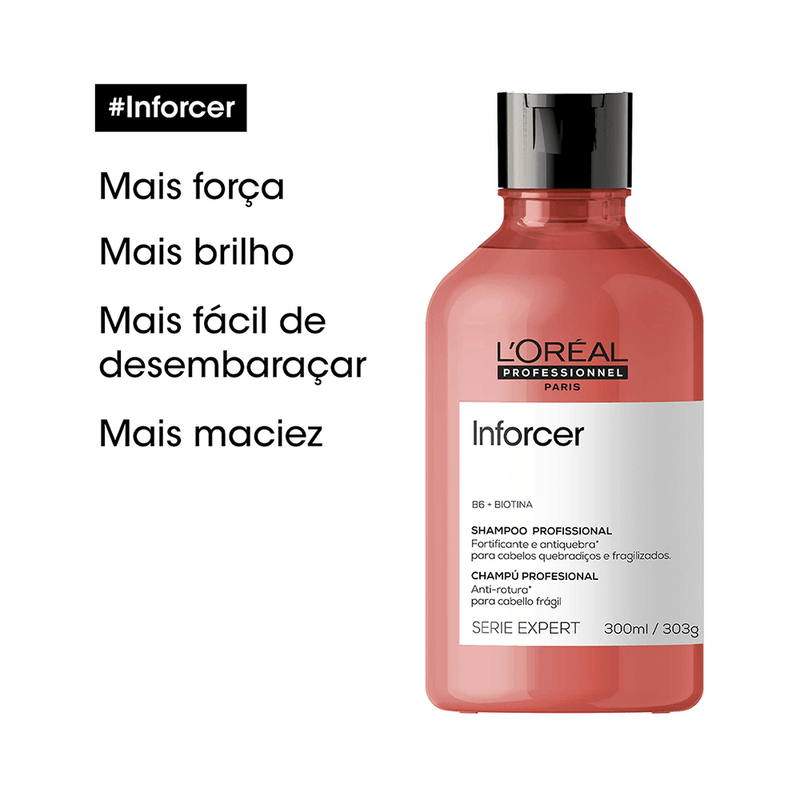 ESTE KIT CONTÉM: 1 - SHAMPOO INFORCER LORÉAL PROFESSIONNEL SERIE EXPERT 300ML 1 - MÁSCARA INFORCER LORÉAL PROFESSIONNEL SERIE EXPERT 250G Shampoo para cabelos frágeis e quebradiços. L'Oréal Serie Expert Inforcer limpeza com fortalecimento da fibra capilar e prevenção a quebra. O Shampoo Inforcer deixa o cabelo mais forte, saudável, com brilho e maciez, pois estimula o metabolismo de proteínas para o crescimento dos fios de cabelo já existentes. A Máscara L'Oréal Inforcer oferece um tratamento nutritivo profundo que funciona como suplemento para o cabelo, aumentando a resistência. Sua fórmula dá força para o crescimento saudável e previne que os fio se partam. Ou seja, esse é o cuidado ideal para quem busca cabelos compridos, cheios de saúde e força. A linha Inforcer, de L'Oréal Professionnel, apresenta produtos incríveis formulados com Biotina e Vitamina B6, que ajudam a estimular o crescimento de fios mais fortes e com aparência saudável. - Mais força - Mais brilho - Mais fácil de desembaraçar - Mais maciez