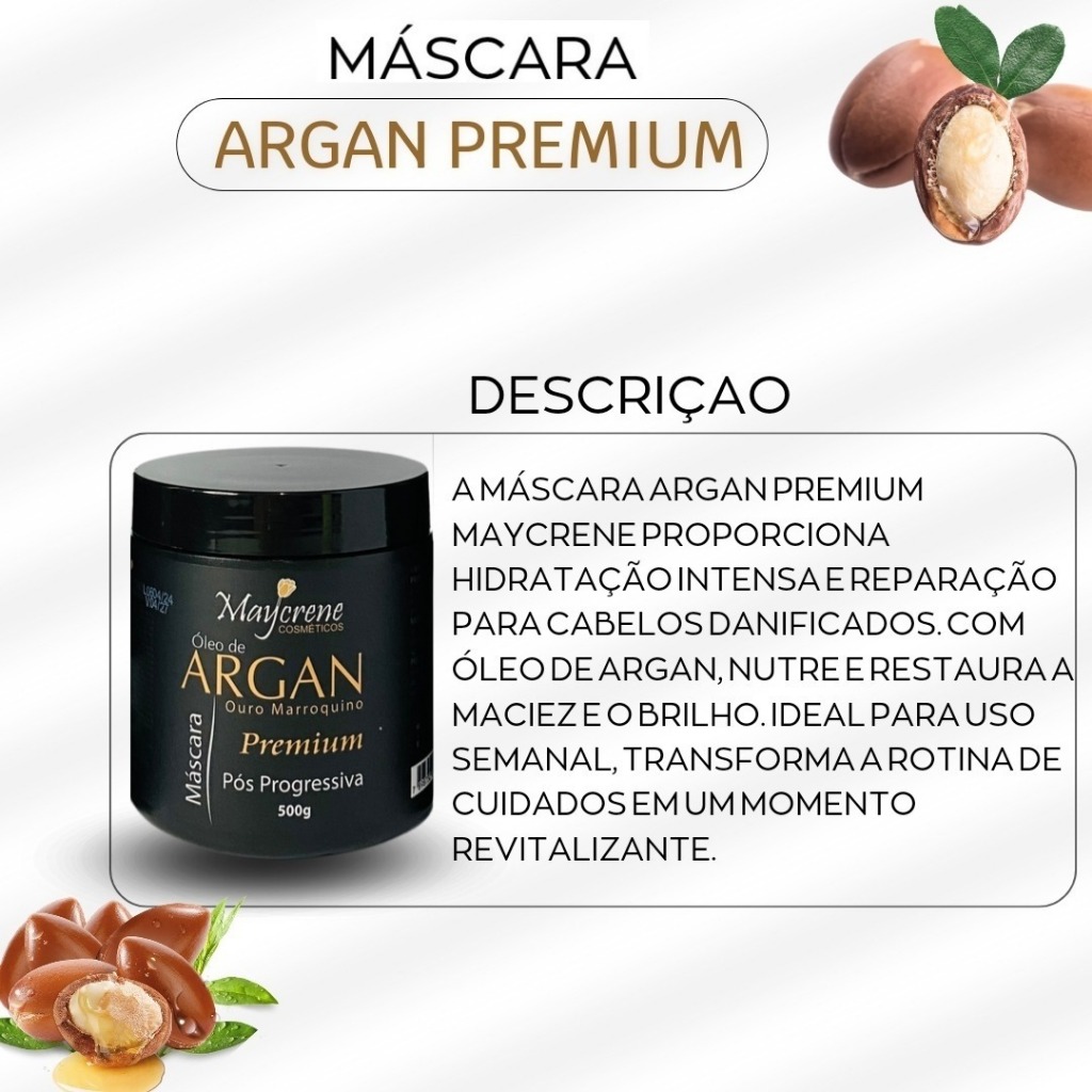 Linha Pós Progressiva Óleo de Argan Ouro Marroquino é ideal para quem fez progressiva ou outros tratamentos alisante, ela contém agentes que reconstroem e revitalizam os cabelos, mantendo o liso por muito mais tempo. Conheça toda a linha Pós Progressiva Óleo de Argan Ouro Marroquino! O shampoo Argan foi desenvolvido para limpar e tratar os cabelos. Enriquecido com óleo de argan garante a eficiência no tratamento capilar, excelente para promover hidratação e restauração dos fios, sendo ideal para cabelos que passam por processos químicos, inclusive tratamento pós-progressiva, mantendo o liso por muito mais tempo. A mascara de hidratação oleo de argan foi desenvolvida para cabelos secos e quebradiços , proporciona brilho , maciez e sedosidade pos progressiva. Benefícios: - Reconstrução rápida e profunda dos fios - Revitalização dos cabelos - Mantém o liso por mais tempo - Hidratação profunda - Alta nutrição - Ideal para cabelos com progressiva Modo de Usar: 1- Aplique o Shampoo na raiz do cabelo massageando suavemente até formar uma espuma. Enxágue. 2- Para selar as cutículas do fio use a mascara de hidratação aplicando do meio para as pontas. Deixe agir por 5 minutos e enxague com água fria para dar brilho. 3- Finalize o cabelo como de costume. Para potencializar ainda mais o tratamento aplique o Óleo de Argan Naturiun nos fios após lavar os cabelos ou coloque algumas gotas na máscara hidratante. Você irá notar uma grande diferenç O QUE VOCE IRA RECEBER: 1 Shampoo Pós Progressiva Óleo de Argan 500ml Maycrene 1 Mascara de hidratação Pós Progressiva Óleo de Argan 500g Maycrene 1 oleo de argan reparador de pontas 60ml maycrene