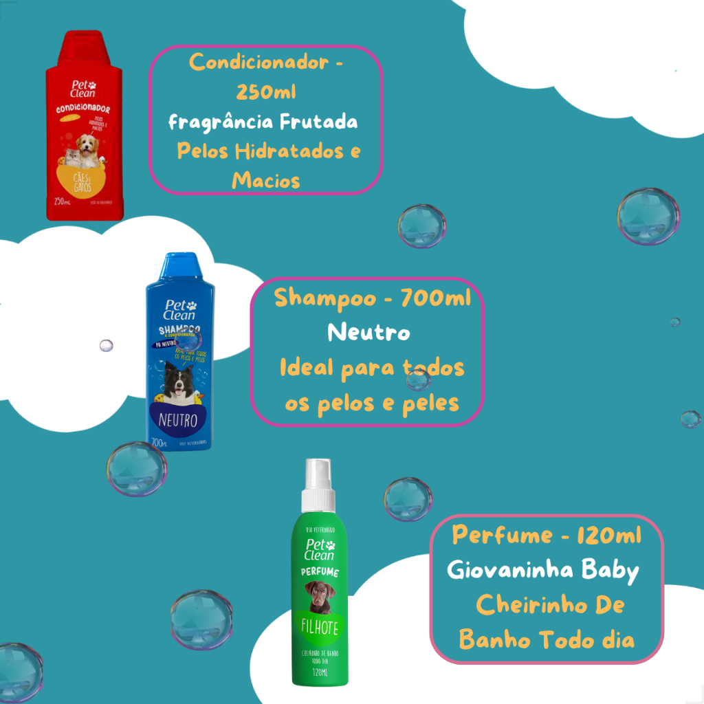 KIT Shampoo, Perfume, Condicionador e Esponja lava Pelos Pet Clean Cães e Gatos