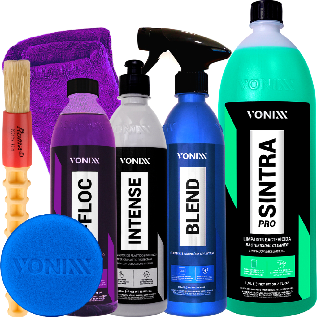 KIT CONTÉM: SINTRA PRO 1,5L BLEND SPRAY INTENSE 500ML V-FLOC 500ML APLICADOR DE ESPUMA VONIXX PINCEL ROMA PANO 40X40CM ------------------------------------------------------- SINTRA PRO 1,5L - LIMPEZA INTERNA DE VEÍCULOS DESCRIÇÃO: Sintra Pro é um multilimpador flotador bactericida de pH balanceado e ultra concentrado, indicado para limpeza de painéis, laterais e cantos de portas, bancadas de couro, carpetes e estofados. Promove alto poder de remoção de manchas de gordura e sujeiras diversas, além de eliminar microrganismos causadores de doenças no interior do veículo DILUIÇÃO: Limpeza de laterais de portas, plásticos e couro muito encardido – 1:5 Carpetes, estofados e limpeza de teto – 1:10 (sujeira pesada); 1:20 (sujeira média); 1:30 (sujeira leve) Manutenção de limpeza interna em painéis, laterais de portas e bancos de couro – 1:50 MODO DE USO: Em painéis, laterais e cantos de portas e bancos de couro: 1. Diluir o produto na proporção conforme indicação 2. Com o auxílio de um pulverizador, aplicar a solução na área a ser limpa 3. Utilizar pincel, escova macia ou aplicador de espuma e realizar movimentos circulares até observar o desprendimento total da sujeira 4. Remover o excesso com auxílio de toalha de microfibra úmida Em carpetes, estofados e tecidos: 1. Diluir o produto na proporção conforme indicação 2. Com o auxílio de um pulverizador, aplicar a solução na área a ser limpa 3. Utilizar escova macia ou aplicador de espuma e realizar movimentos circulares até observar o desprendimento total da sujeira 4. Utilizar aspirador específico para remoção de água e aspirar toda a sujeira 5. Aguarde secar completamente ------------------------------------------------------- INTENSE 500ML - RENOVADOR DE PLÁSTICOS INTERNOS DESCRIÇÃO: Intense é um renovador de plásticos com proteção UV, cuja fórmula balanceada promove acabamento natural e toque seco, com durabilidade de 6 meses. MODO DE USO: 1. Certifique-se que a superfície esteja limpa e seca 2. Aplique uma pequena quantidade de produto de maneira uniforme com o auxílio de um aplicador de microfibra 3. Espalhe bem até o total preenchimento da peça ------------------------------------------------------- V-FLOC 500ML - LAVA AUTOS SUPER CONCENTRADO DESCRIÇÃO: V-Floc é um lava autos de alta performance e de pH neutro. Sua fórmula contém agentes condicionadores e tensoativos especiais que proporcionam uma lavagem suave e eficiente. MODO DE USO: 1. Realizar a pré-lavagem do veículo para retirada do excesso de sujeira 2. Diluir aproximadamente 10ml de V-FLOC em 4 litros de água; Recomendamos ajustar a quantidade de produto de acordo com o nível de sujeira 3. Iniciar a lavagem com o auxílio de Luva de Microfibra, sempre começando pela parte superior do veículo 4. Mergulhar a luva na solução e esfregar suavemente, até completar todo o veículo 5. Enxaguar em seguida até a retirada de todo o produto 6. Recomendamos o uso da Toalha de Secagem para finalizar ------------------------------------------------------- BLEND CERAMIC SPRAY WAX 500ML - CERA LÍQUIDA COM SIO2 E CARNAÚBA DESCRIÇÃO: Blend Ceramic & Carnaúba Spray Wax é uma cera híbrida, composta por SiO2 e pela mais pura carnaúba tipo 1 e que protege a superfície veicular por até quatro meses. O produto promove a resistência cerâmica, brilho quente da carnaúba e hidrorrepelência. DURABILIDADE: Até quatro meses de durabilidade MODO DE USAR: 1. Agite bem o produto antes de usar 2. Após lavar o veículo, pulverize uma pequena quantidade do produto na pintura. Mantenha uma distancia de 20 cm em uma área não superior à 60 cm x 60 cm 3. Sem deixar secar, realize o acabamento utilizando toalha de microfibra limpa e seca, até obter o brilho desejado 4. Continue fazendo o processo até a conclusão total do veículo Obs: Em caso de manchas, aplicar novamente o produto.