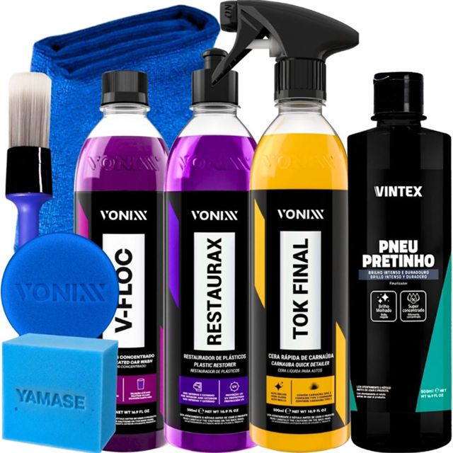 KIT CONTÉM: V-FLOC 500ML RESTAURAX 500ML TOK FINAL 500ML PNEU PRETINHO 500ML PANO 40X40CM PINCEL YAMASE APLICADOR DE ESPUMA VONIXX APLICADOR DE ESPUMA YAMASE ------------------------------------------------------- RESTAURAX 500ML - RESTAURADOR DE PLÁSTICOS DESCRIÇÃO: Restaurax renova e restaura superfícies plásticas, como para-choques, painéis e laterais de portas. Sua fórmula contém polímeros especiais que também protegem as peças contra as ações do tempo, evitando degradação precoce do material. DURABILIDADE: Até seis meses de proteção nos plásticos internos e sessenta dias nos plásticos externos. MODO DE USO: 1. Limpar bem a superfície e em seguida aplicar o produto com um aplicador de espuma até a completa restauração. Se necessário, repetir a operação. 2. Para manter o plástico sempre novo, repetir a aplicação do produto a cada 60 dias na parte externa e a cada 6 meses na parte interna. Obs: Para um resultado com menos brilho, realizar acabamento com uma microfibra. ------------------------------------------------------- PNEU PRETINHO 500ML VINTEX DESCRIÇÃO: O Pneu Pretinho é um produto que foi especialmente desenvolvido para proteger, conservar e dar brilho aos pneus em geral. Promove proteção prolongada, brilho intenso e duradouro que deixa os pneus com aspecto de novos. - Brilho molhado - Super concentrado MODO DE USO: 1. Lave bem os pneus removendo toda a sujeira como lama, barro, etc... 2. Em seguida, aplique o produto puro com o auxílio do Aplicador de Espuma ------------------------------------------------------- V-FLOC 500ML - LAVA AUTOS SUPER CONCENTRADO DESCRIÇÃO: V-Floc é um lava autos de alta performance e de pH neutro. Sua fórmula contém agentes condicionadores e tensoativos especiais que proporcionam uma lavagem suave e eficiente. MODO DE USO: 1. Realizar a pré-lavagem do veículo para retirada do excesso de sujeira 2. Diluir aproximadamente 10ml de V-FLOC em 4 litros de água; Recomendamos ajustar a quantidade de produto de acordo com o nível de sujeira 3. Iniciar a lavagem com o auxílio de Luva de Microfibra, sempre começando pela parte superior do veículo 4. Mergulhar a luva na solução e esfregar suavemente, até completar todo o veículo 5. Enxaguar em seguida até a retirada de todo o produto 6. Recomendamos o uso da Toalha de Secagem para finalizar ------------------------------------------------------- CARNAÚBA TOK FINAL - CERA DE MANUTENÇÃO EM SPRAY DESCRIÇÃO: Tok Final foi desenvolvida com a mais pura cera de carnaúba cearense e polímeros de última geração, que protegem e realçam o brilho de pinturas automotivas. É ideal para ser usada após a lavagem e na manutenção da proteção da pintura do veículo entre os enceramentos. Pode ser aplicada em toda parte do veículo, incluindo vidros, para-choques e borrachas DURABILIDADE: Até 30 dias de proteção MODO DE USO: 1. Agitar bem o produto antes de usar 2. Após lavar e secar o veículo, pulverizar o produto puro na superfície em área não superior à 60cm x 60cm 3. Em seguida, realizar o acabamento com toalha ou pano de microfibra até obter o brilho desejado 4. Repetir o procedimento até a conclusão do veículo
