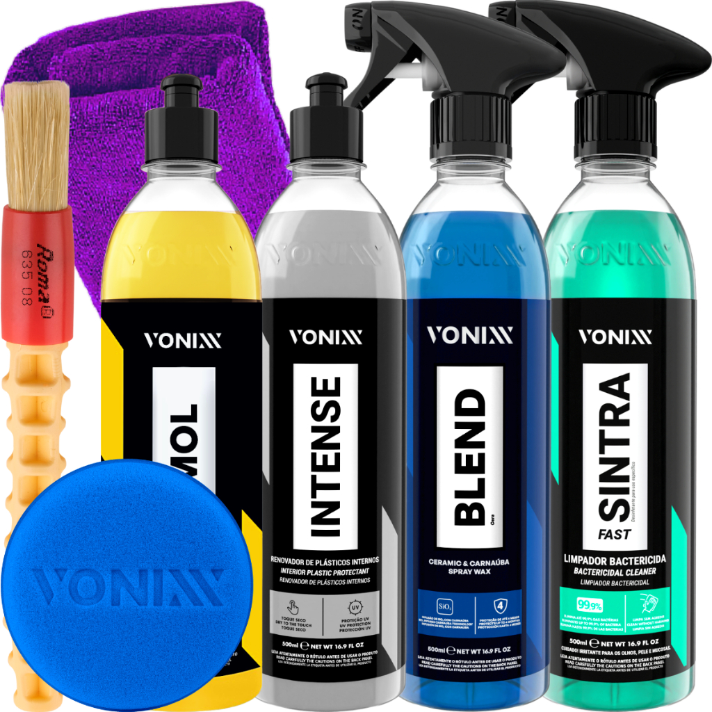 KIT CONTÉM: SINTRA FAST BLEND SPRAY INTENSE 500ML V-MOL 500ML APLICADOR DE ESPUMA VONIXX PINCEL ROMA PANO 40X40CM ------------------------------------------------------- SINTRA FAST 500ML - LIMPEZA INTERNA DE VEÍCULOS DESCRIÇÃO: Sintra Fast é um multilimpador flotador universal, bactericida e germicida de pH balanceado, indicado para limpeza de painéis, laterais e cantos de portas, bancadas de couro, carpetes e estofados. MODO DE USO: Em painéis, laterais, cantos de portas e bancos de couro: 1. Pulverizar o produto na superfície a ser limpa e desinfetada 2. Utilizar pincel, escova macia ou aplicador de espuma e realizar movimentos circulares até observar o desprendimento total da sujeira 3. Remover o excesso com auxílio de toalha de microfibra úmida. Secar em seguida com uma toalha de microfibra seca ------------------------------------------------------- INTENSE 500ML - RENOVADOR DE PLÁSTICOS INTERNOS DESCRIÇÃO: Intense é um renovador de plásticos com proteção UV, cuja fórmula balanceada promove acabamento natural e toque seco, com durabilidade de 6 meses. MODO DE USO: 1. Certifique-se que a superfície esteja limpa e seca 2. Aplique uma pequena quantidade de produto de maneira uniforme com o auxílio de um aplicador de microfibra 3. Espalhe bem até o total preenchimento da peça ------------------------------------------------------- V-MOL 500ML - LAVA AUTOS DESINCRUSTANTE DESCRIÇÃO: Produto lava autos desincrustante com pH levemente básico que não agride a superfície do veículo. Excelente na remoção de sujeiras mais difíceis como remoção de barro e óleo DILUIÇÃO: Sujeira leve/manutenção: 1:100 Sujeira Média: 1:50 Sujeira pesada 1:10 MODO DE USO: 1. Diluir o produto na proporção indicada. 2. Iniciar a lavagem com o auxilio de uma luva de mcrofibra, sempre começando pelas partes superiores do veículo 3. Mergulhar a luva na solução e esfregar suavemente até completar o veículo 4. Enxaguar em seguida até a retirada de todo o produto 5. Secar o veículo por completo a fim de evitar manchas ------------------------------------------------------- BLEND CERAMIC SPRAY WAX 500ML - CERA LÍQUIDA COM SIO2 E CARNAÚBA DESCRIÇÃO: Blend Ceramic & Carnaúba Spray Wax é uma cera híbrida, composta por SiO2 e pela mais pura carnaúba tipo 1 e que protege a superfície veicular por até quatro meses. O produto promove a resistência cerâmica, brilho quente da carnaúba e hidrorrepelência. DURABILIDADE: Até quatro meses de durabilidade MODO DE USAR: 1. Agite bem o produto antes de usar 2. Após lavar o veículo, pulverize uma pequena quantidade do produto na pintura. Mantenha uma distancia de 20 cm em uma área não superior à 60 cm x 60 cm 3. Sem deixar secar, realize o acabamento utilizando toalha de microfibra limpa e seca, até obter o brilho desejado 4. Continue fazendo o processo até a conclusão total do veículo Obs: Em caso de manchas, aplicar novamente o produto.