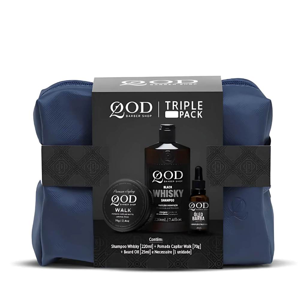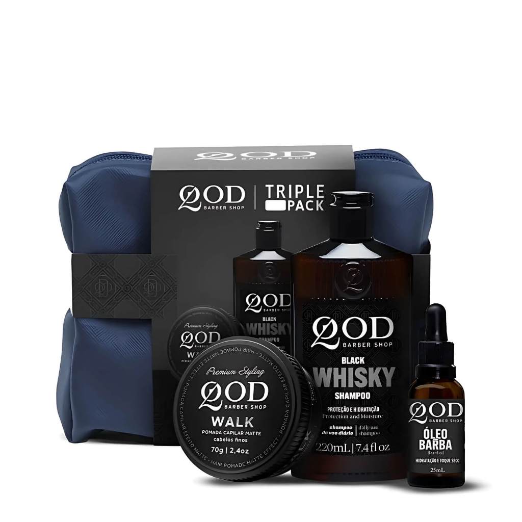 QBS KIT TRIPLE PACK - SHAMPOO BLACK WHISKY 220ML+ POMADA WALK MATTE 70G + ÓLEO DE BARBA 25ML + NECESSAIRE AZUL O kit contém: • 1 Nécessaire Azul • 1 Shampoo Black Whisky 220ml • 1 Pomada Walk Matte 70g • 1 Óleo de Barba 25ml SHAMPOO BLACK WHISKY O Black Whisky Shampoo QBS possui extrato de milho, centeio e cevada, que proporcionam hidratação profunda e protegem os fios das agressões externas. Com ingredientes selecionados e exclusivos, é um produto que carrega a paixão pelo estilo clássico, marca registrada da QOD Barber Shop! Benefícios Black Whisky: Limpeza diária para cabelo, corpo e barba Proteção Fragrância exclusiva Hidratação Modo de usar: Shampoo Black Whisky: Aplique o produto nos cabelos úmidos, massageando até a formação de espuma. Enxágue em seguida. Se necessário, repita o processo. Para melhores resultados, use diariamente. POMADA CAPILAR WALK MATTE Pomada ideal para quem busca mais liberdade para modelar os cabelos durante o dia. "Walk on the wild side", de Lou Reed foi uma das músicas mais tocadas em 1972 nos inspirou a criar a pomada. Benefícios Pomada Walk: Livre de parabenos e silicones Estrutura cabelos finos e curtos Não pesa ao longo do dia Efeito Matte Média fixação A Pomada Capilar Walk Efeito Matte QBS tem médio poder de retenção de penteados e é fácil de remover. A Walk da QBS é a segurança de ter o seu cabelo modelado sem desestruturar facilmente todos os tipos de cabelo, principalmente os cabelos finos e curtos. Com a Pomada Capilar Walk Efeito Matte QBS você garante melhores efeitos de estilização para cortes desconectados ou assimétricos que precisam de texturização, pois ela é feita com cera de abelhas em uma concentração que não pesa nos fios. Seus polímeros fixadores seguram o penteado ao longo do dia e os ativos condicionantes agem nos fios tratando e os deixando macios. Modo de usar Pomada Walk Matte: Espalhe nas mãos uma pequena quantidade do produto, esfregue e aplique nos cabelos secos ou úmidos, estilizando como desejar. ÓLEO DE BARBA Óleo de Barba QOD, contém ômegas 3 e 6 que repõem os ácidos graxos essenciais aos fios, nutrindo-os profundamente. Com fórmula leve e secagem rápida, hidrata até as barbas mais ressecadas sem pesar, deixando um toque seco e aveludado. Benefícios Beard Oil: Hidratação e nutrição Toque seco Secagem rápida Modo de usar Beard Oil: Óleo de Barba: Aplique algumas gotas do produto nas mãos espalhe na barba e bigode, massageando. Não necessita de enxágue.
