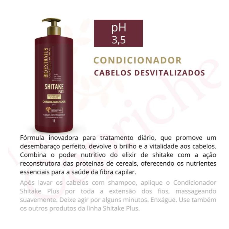 Desenvolvida para recuperar os cabelos desvitalizados. Combina o poder nutritivo do Elixir de Shitake à ação reconstrutora das proteínas dos cereais. Kit Shampoo, Condicionador e Máscara Shitake Bio Extratus - 1L Reconstrução Nutritiva Desenvolvida para recuperar os cabelos desvitalizados. Combina o poder nutritivo do Elixir de Shitake à ação reconstrutora das proteínas dos cereais. SHAMPOO 1L LIMPEZA NUTRITIVA Limpeza suave que dá brilho e devolve a vitalidade ao cabelo. Distribua uniformemente sobre o cabelo molhado, massageando suavemente sem esfregar os fios. Enxágue bem e, se necessário, repita a aplicação. CONDICIONADOR 1L CONDICIONAMENTO NUTRITIVO Desembaraça facilmente sem danificar os fios, devolve o brilho e a vitalidade aos cabelos.