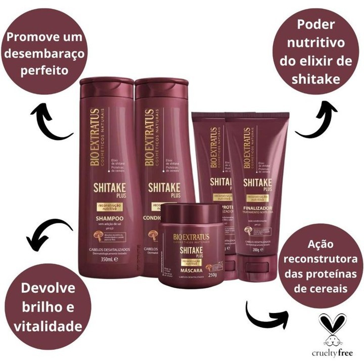 🔥 Compras efetuadas até as 11hs são enviadas no mesmo dia! 🍄🟫 KIT SHITAKE SHAMPOO 350ML + CONDICIONADOR 200ML + BRINDE 2 SACHÊS DE AMOSTRAS - BIO EXTRATUS 🍄🟫 Tratamento para cabelos danificados e sem vida. Com ativos nutritivos e proteínas do cogumelo Shitake, este kit promove força, brilho e vitalidade aos fios. Contém no kit: Shampoo Shitake Plus 350ml – Limpa suavemente, preparando os fios para o tratamento. Rico em nutrientes que fortalecem a fibra capilar. Condicionador Shitake Plus 200ml – Hidrata e desembaraça, deixando os cabelos macios e com brilho intenso. Modo de uso: Aplique o shampoo nos cabelos molhados, massageando suavemente. Enxágue bem. Em seguida, aplique o condicionador no comprimento e pontas. Deixe agir por alguns minutos e enxágue completamente. Indicado para cabelos fragilizados. Uso diário. Resultados visíveis desde a primeira aplicação. Limpeza suave que dá brilho e devolve a vitalidade ao cabelo. pH 6,0. Sem adição de sal.
