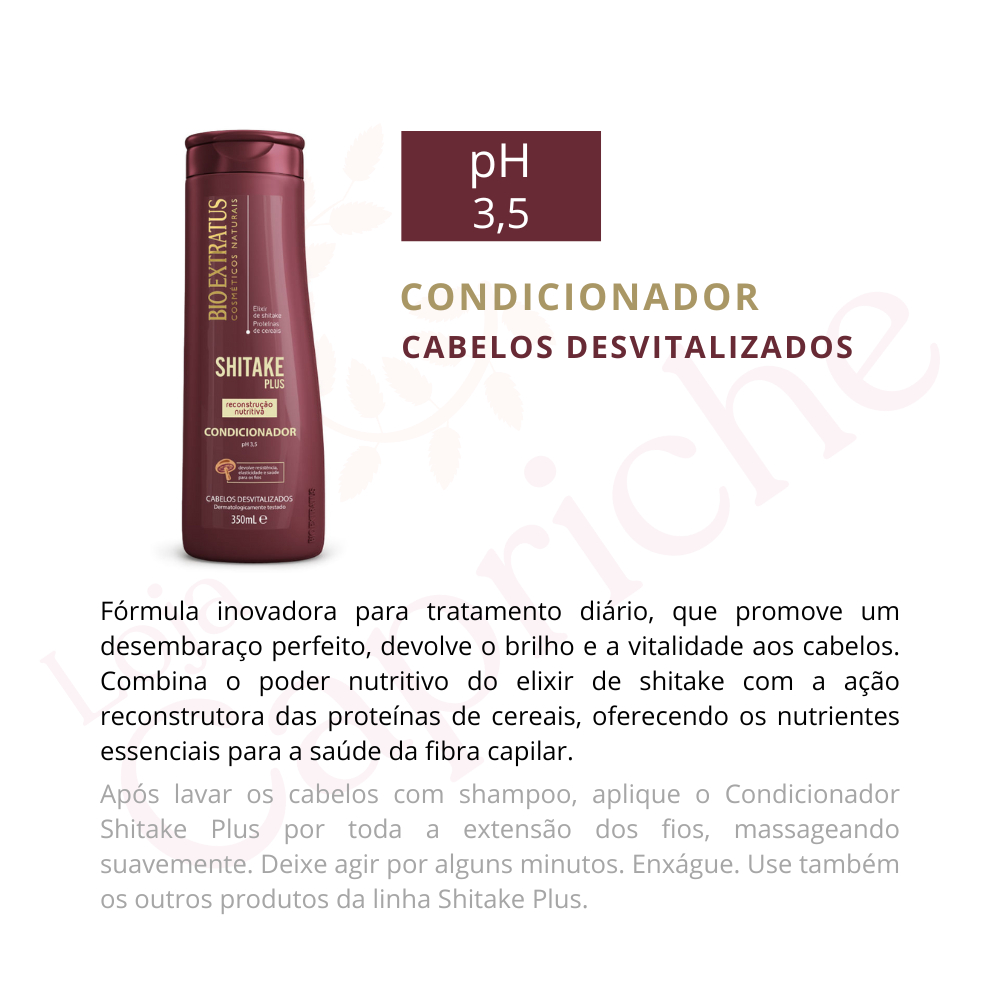 Kit Shitake Shampoo e Condicionador 350mL e Máscara 250g Bio Extratus Desenvolvida para recuperar os cabelos desvitalizados. Combina o poder nutritivo do Elixir de Shitake à ação reconstrutora das proteínas dos cereais. SHAMPOO 350mL LIMPEZA NUTRITIVA Limpeza suave que dá brilho e devolve a vitalidade ao cabelo. Distribua uniformemente sobre o cabelo molhado, massageando suavemente sem esfregar os fios. Enxágue bem e, se necessário, repita a aplicação. CONDICIONADOR 350mL CONDICIONAMENTO NUTRITIVO Desembaraça facilmente sem danificar os fios, devolve o brilho e a vitalidade aos cabelos. Para uso diário, deve ser aplicado após o shampoo. Na hidratação semanal, use após a máscara hidratante, massageando suavemente. Para maior absorção dos ativos deixe agir de 1 a 2 minutos. Enxágue. MÁSCARA 250g HIDRATAÇÃO NUTRITIVA Hidrata profundamente os fios, oferecendo os principais nutrientes essenciais à restauração da fibra capilar. Recupera a vitalidade e dá brilho intenso ao cabelo. Após lavar o cabelo, aplique a máscara massageando mecha a mecha. Deixe agir por 10 minutos. Para intensificar o tratamento, use touca de hidratação. Enxágue. INDICAÇÃO Cabelo desvitalizado. FUNÇÃO Devolver a resistência, a elasticidade e a saúde dos fios. RESULTADOS E BENEFÍCIOS Cabelos com brilho intenso, leves e com a estrutura capilar totalmente reparada. CONTÉM: 1- Shampoo Shitake Bio Extratus 350mL 1- Condicionador Shitake Bio Extratus 350mL 1- Máscara Shitake Bio Extratus 250g
