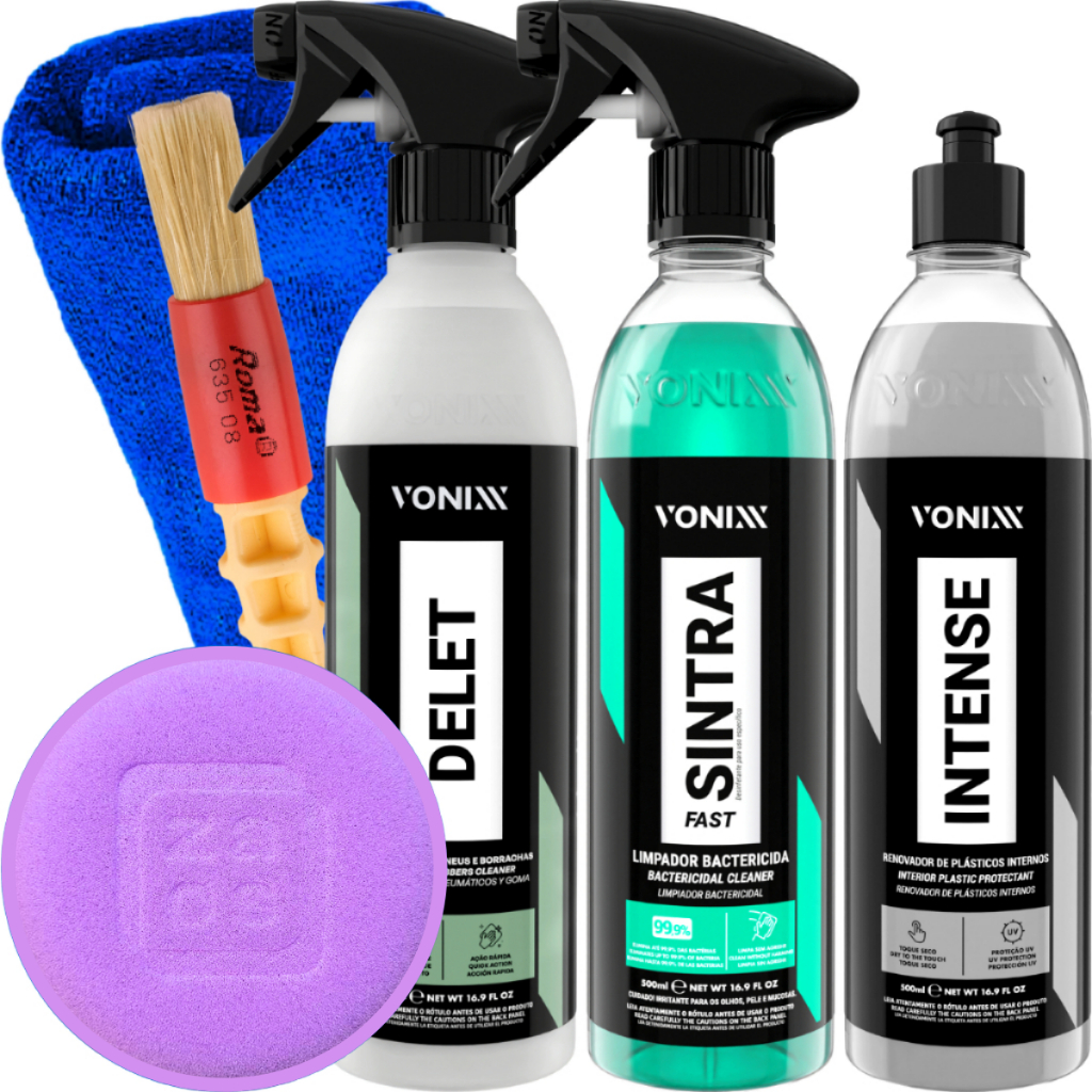 KIT CONTÉM: DELET 500ML VONIXX SINTRA FAST VONIXX INTENSE 500ML VONIXX PINCEL ROMA APLICADOR ESPUMA PANO 40x40 JS -------------------------------------------------------------- DELET LIMPADOR PARA PNEUS E BORRACHAS 500ML VONIXX DESCRIÇÃO: É um limpador de alta performance, formulado exclusivamente para remover sujidade severa em pneus e borrachas, garantindo total limpeza devolvendo originalidade e sem deixar aspecto acizentado. Essa limpeza ajudará a melhorar a performance dos produtos para condicionar os pneus. MODO DE USO: 1. Com o pneu ainda seco, pulverizar a espuma do produto em todo pneu 2. Deixar o produto agir de 30 a 60 segundos, ou até observar uma mudança de coloração da espuma de branco para cinza, marrom ou preto 3. Fazer a escovação por completo utilizando uma escova para limpeza de pneus 4. Fazer um enxágue com jato de água -------------------------------------------------------------- SINTRA FAST 500ML DESCRIÇÃO: Sintra Fast é um multilimpador flotador universal, bactericida e germicida de pH balanceado, indicado para limpeza de painéis, laterais e cantos de portas, bancadas de couro, carpetes e estofados. MODO DE USO: Em painéis, laterais, cantos de portas e bancos de couro: 1. Pulverizar o produto na superfície a ser limpa e desinfetada 2. Utilizar pincel, escova macia ou aplicador de espuma e realizar movimentos circulares até observar o desprendimento total da sujeira 3. Remover o excesso com auxílio de toalha de microfibra úmida. Secar em seguida com uma toalha de microfibra seca -------------------------------------------------------------- INTENSE 500ML DESCRIÇÃO: Intense é um renovador de plásticos com proteção UV, cuja fórmula balanceada promove acabamento natural e toque seco, com durabilidade de 6 meses. MODO DE USO: 1. Certifique-se que a superfície esteja limpa e seca 2. Aplique uma pequena quantidade de produto de maneira uniforme com o auxílio de um aplicador de microfibra 3. Espalhe bem até o total preenchimento da peça