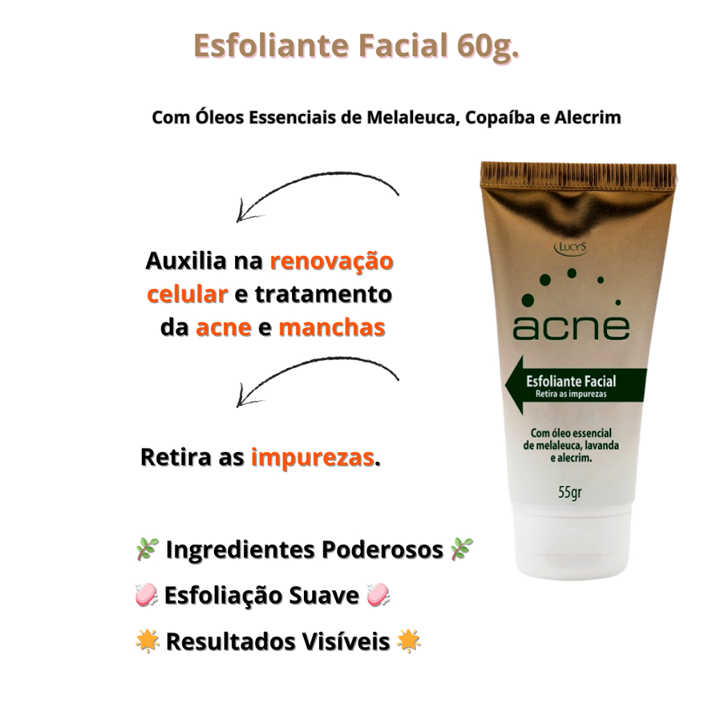 Skincare Limpeza de Pele Auxilia no Tratamento de Acne Cravos Espinhas Linha Acne Lucy's Transforme sua rotina de cuidados com a pele com o nosso Kit Skincare para Limpeza Profunda e Tratamento de Acne Se você está em busca da pele dos sonhos, livre de acne, cravos e espinhas, nós temos a solução perfeita para você. Apresentamos nosso Kit Skincare especialmente formulado com ingredientes poderosos para uma pele radiante e saudável. 1 - Sabonete facial Antiacne e Oleosidade Acne Lucy's -120ml AUXILIA NO CONTROLE DA OLEOSIDADE DA PELE. LIMPA PROFUNDAMENTE. RETIRA TODA IMPUREZA DA PELE *PH fisiológico *Limpa e previne a acne. * Desobstrui e reduz os poros. * Uso diário. **ÓLEO ESSENCIAL DE MELALEUCA** - Cicatrizante- Antisséptico. - Tratamento da Acne. 2- Esfoliante Facial com Óleos Essenciais Acne Lucy's - 55gr ***********ÓLEO ESSENCIAL DE MELALEUCA*************** - Cicatrizante- Antisséptico. - Tratamento da Acne. ****ÓLEO DE COPAÍBA**** - Anti-inflamatório - Antisséptico no Tratamento da Acne. ***ÓLEO ESSENCIAL DE ALECRIM**** - Cicatrizante - Antisséptico e Regulador da Oleosidade. - Tratamento da Acne. *Auxilia na renovação celular e tratamento de acne e manchas. *Retira impurezas. *Indicado para ser usado duas vezes por semana. *Com óleo essencial de Melaleuca, Copaíba e Alecrim. 3 - Máscara Facial com Argila Branca e Óleos Essenciais Acne Lucy's - 60gr ATENÇÃO: NOVA EMBALAGEM PARA A MÁSCARA COM ARGILA BRANCA. ***********ÓLEO ESSENCIAL DE MELALEUCA*************** - Cicatrizante- Antisséptico.- Tratamento da Acne. ************ÓLEO DE COPAÍBA*************** - Anti-inflamatório- Antisséptico no Tratamento da Acne. ************ÓLEO ESSENCIAL DE ALECRIM**************** - Cicatrizante - Antisséptico e Regulador da Oleosidade. - Tratamento da Acne. ************ARGILA BRANCA*************** - Elimina toxinas da pele e ativa a regeneração celular. - Tratamento de Manchas, Rugas, Cicatrizes e Acne. * Auxilia no clareamento de manchas. *Cicatrizes de acne. *Controle da oleosidade. *Tratamento e cicatrização da acne e no amolecimento de cravos. * Pode ser usado duas vezes por semana. * Com óleo essencial de Melaleuca, Alecrim e Copaíba. * Estimula o Colágeno e Elastina. 4 - Sérum Amolecedor de Cravos Acne Lucy's 85ml.Auxilia na dilatação dos poros e amolecimento dos cravos. Facilita a remoção dos cravos. Com óleo essencial de Melaleuca e Alecrim, eficientes no cuidado da acne. Auxilia na redução de aparecimento de novos cravos e na cicatrização de espinhas. Ação Anti-inflamatória. Ação Antisséptica. ***********ÓLEO ESSENCIAL DE MELALEUCA*************** - Cicatrizante- Antisséptico. - Tratamento da Acne. ************ÓLEO ESSENCIAL DE ALECRIM**************** - Cicatrizante- Antisséptico e Regulador da Oleosidade. - Tratamento da Acne. Modo de Usar: Aplicar o Sérum Amolecedor por todo rosto. Deixar agir pelo mínimo de 20 minutos. (Se possível utilizar máscara térmica). Lavar com água em abundância. Efetuar a remoção dos cravos que sairão com muito mais facilidade. Precauções: Não aplicar sobre pele irritada ou lesionada. Não ingerir. Em caso de irritação suspender o uso do Sérum. Manter em local fresco. Manter fora do alcance das crianças. 5 - Tônico Adstringente Acne Lucy`s - 85ml. Nosso Tônico contém ação calmante, auxilia no controle da oleosidade excessiva e reduz os poros após a remoção dos cravos. Não possui álcool. MODO DE USAR: Após a Limpeza da pele, aplicar o produto com auxilio de algodão e deixar secar naturalmente. PRECAUÇÕES: Manter em local seco e fresco. Não ingerir. Manter fora do alcance de crianças. Evitar contato com os olhos, em caso de contato lavar com água em abundância. Em caso de irritação suspender o uso. Transforme sua pele com confiança e diga adeus à acne, cravos e espinhas! Adquira o nosso Kit Skin Care hoje e descubra o segredo de uma pele impecável. Não perca esta oportunidade de ter uma pele linda e saudável. Garanta o seu Kit Skin Care agora! Embalagem contém: 1 - Sabonete facial Anti-acne e Oleosidade Acne Lucy's -120ml 1- Esfoliante Facial com Óleos Essenciais Acne Lucy's - 55gr 1 - Máscara Facial com Argila Branca e Óleos Essenciais Acne Lucy's - 60gr 1- Sérum Amolecedor de Cravos Acne Lucy's 85ml. 1 - Tônico Adstringente Acne Lucy`s - 85ml. ENVIAREMOS EM ATÉ 24H APÓS CONFIRMAÇÃO DO PGTO. Exceto finais de semanas e feriados.