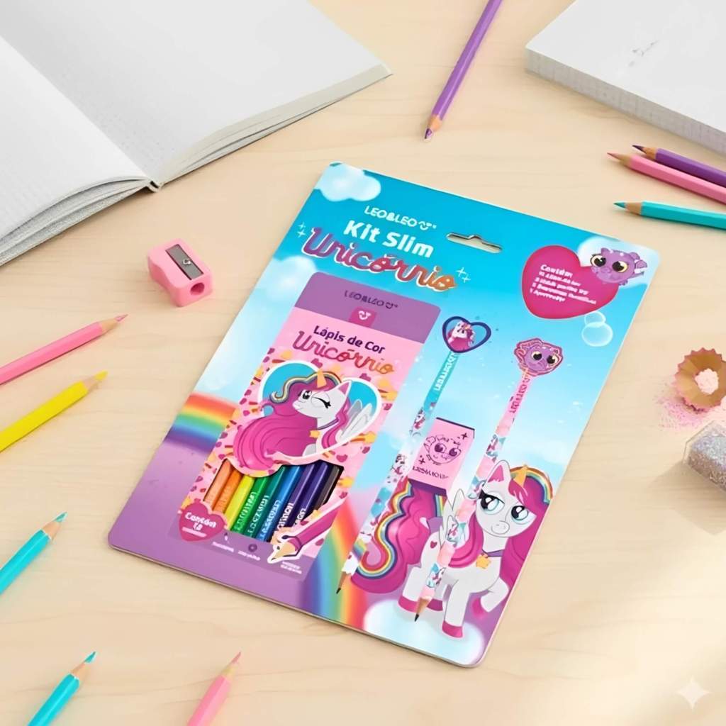 Kit Slim Lápis de Cor 12 Cores + 2 Lapis Hb c/ Borracha + Apontador Unicórnio Leonora - 10626