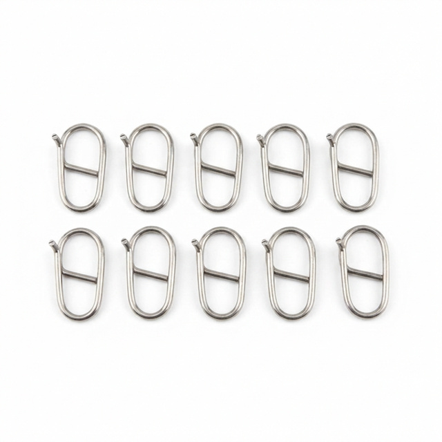 Descrição do Snap Engate Rápido: Material: Aço inoxidável Pacote com: 2 / 5 / 10 / 20 peças conector de isca de pesca encaixe Força: 40 LBS / 18 Kg Comprimento do Comprimento: 1,5 cm (15mm) ---------------------------------------------------------------------------------------------------------------------------------------------------------- Característica do recurso: 1.Feito de aço inoxidável, pode ser usado para água salgada, não é fácil de enferrujar, resistente e mais durável. 2.A fivela flexível e confiável pode fazer você alterar líderes ou iscas em segundos. 3.Leve e portátil, conveniente para transportar e armazenar. 4.A superfície lisa pode proteger sua linha de pesca contra danos.