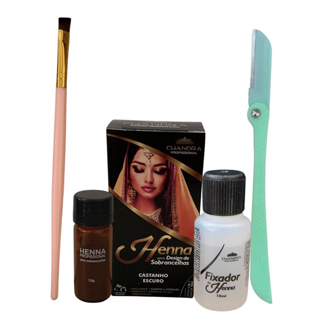 Kit sobrancelha Henna Rena Designer pelo e pele Chandra Navalha e Pincel chanfrado natural fixacao