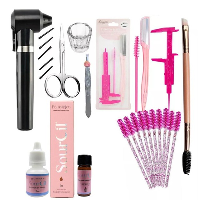 Kit sobrancelha henna sourcil iniciante mixer misturador pincel escovinha navalha tesoura paquimetro