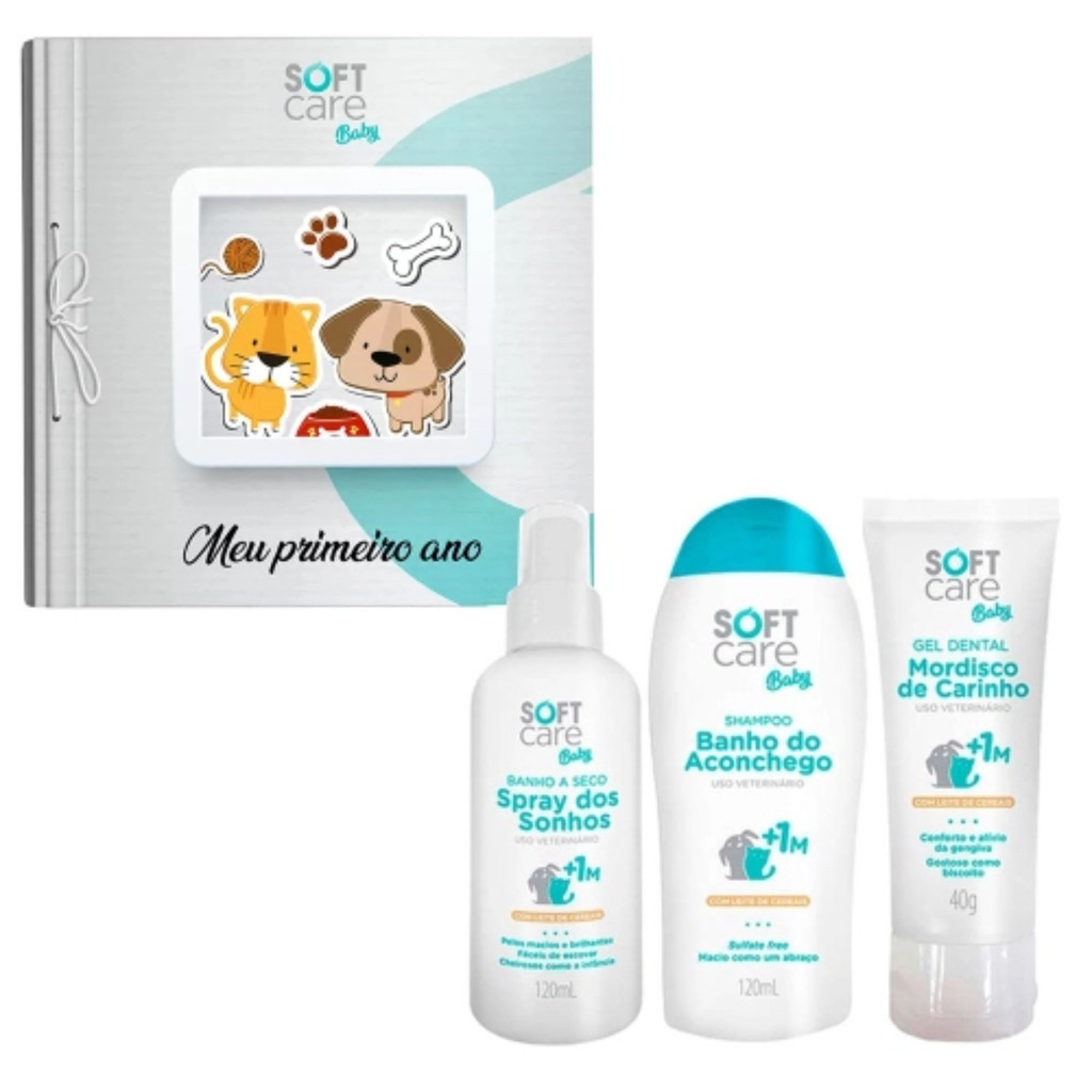 KIT SOFT CARE BABY- MORDISCO DE CARINHO, SPRAY DS SONHOS E BANHO DE ACOMCHEGO PARA CÃES E GATOS - PET SOCIETYShampoo Banho do Aconchego Soft care Baby para cães e gatos + 1 mêsFormulado sem sulfato e com pH fisiológico para promover a limpeza sem agredir a pele do seu filhotinho, proporcionando maciez e brilho aos fios.Modo de usar: Molhe o seu pet e aplique o Shampoo Soft Care Baby Banho do Aconchego para Cães e Gatos, massageando por todo o corpo, evitando os olhos e a boca. Enxágue, caso necessário repita a aplicação.Banho a Seco Soft Care Baby 120 ml para cães e gatos + 1 mêsIdeal para cuidar da limpeza do seu filhotinho de forma prática e sem agredir a pele, proporcionando vitalidade aos fios com um cheirinho delicioso como o da infância.Modo de usar: Uso tópico. Aplicar o Banho a Seco Spray dos Sonhos por toda a pelagem, espalhar levemente com as mãos e proceder a escovação normal.Gel Dental Soft Care Baby 40 g para cães e gatos + 1 mêsÓtima opção para a higiene bucal do seu pet, principalmente para aqueles que possuem dentes e gengivas sensíveis.Modo de usar:Use uma fina camada do gel na gengiva, massageando levemente com os dedos limpos ou escova de cerdas macias. GANHE UM LIVRO: Meu primeiro ano de seu PET
