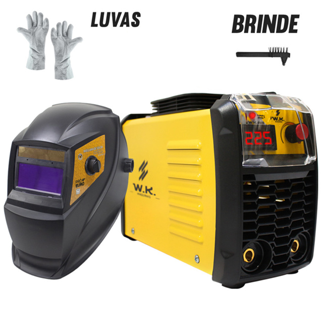 KIT Composto por: Máquina de Solda Inversora WK 225; Máscara PCR 912; Luva Couro. INFORMAÇÕES TÉCNICAS: Grampo terra 1,11 metros; Porta-eletrodo 1,61 metros; 220V; Para SOLDA TIG: Necessário a Tocha Seca, que NÃO acompanha o equipamento; Monofásica; Alimentação: 3x2,5mm² - Cabo como 1,50 metros e Plugue de 20A; Tensão de Entrada: 220V 50Hz - 60Hz; Consumo Máximo: 32A/220V; Grau de Proteção: IP21S; Grau de Isolação: F; Ajuste de Corrente: 20 - 225; Tensão de saída: 59V vazio 220v ; 26V solda; Engate rápido: 9mm; Corrente de Saída Máxima: 225A; Modo de Refrigeração: Ventilação Forçada; Dimensões da máquina Comp/Larg/Altura: 34,5 x 13,5x 25,5cm. Derrete eletrodos: - 6013: 2,5mm, 3,25mm e 4mm; - 7018: 2,5mm, 3,25mm e 4mm; - Inox: 2,5mm e 3,2mm; - Alumínio: 2,5mm e 3,25mm; - Ferro Fundido: 2,5mm e 3,25mm; - Celulose: 2,5mm, 3,25mm e 4mm. CICLO DE TRABALHO: 225A - 50%; 150A - 70%; 125A - 100%. APLICAÇÕES: Empresas de Serralheria; Oficinas de Funilaria; Soldas em Construção civil; Atendimentos a Domicílio. Máscara de Solda Automática com Três Regulagens - Pró Euro Recomendada para todos os tipos de soldagem, corte plasma e até serviços com esmerilhadeira. DIFERENCIAIS: Tripla regulagem; Ajuste de tonalidade e sensibilidade; Escurecimento automático; Carregador solar de bateria; Visor de polietileno; Super confortável, com carneira ajustável, testeira estofada e suporte emborrachado; Pesa apenas 700g; Máscara já vai com bateria modelo 2032 (igual de relógio); Bateria fácil e rápido de trocar; Marca Pró Euro. DESCRIÇÃO TÉCNICA: Área de visão: 93 x 43 mm; Dimensão do filtro: 110 x 90 x 9 mm; Estágio claro: DIN 4; Estágio escuro: DIN 9 ~ 13; Tempo de resposta: 0,0001s; Proteção UV/Infravermelho: DIN 13; Temperatura de proteção: - 5°C ~ 55°C; Temperatura de armazenagem: - 20°C ~70°C; Variação DIN 4 (estágio claro) ao DIN 13 (estágio escuro); CA: 41823. SUGESTÕES DE USO: SMAW – Soldagem por eletrodo revestido; MIG (Pesado) – MIG em materiais pesados; MIG (Leve) – MIG em materiais leves; TIG, GTAW – Processo de soldagem TIG; MAG/CO2 – Soldagem com arco metálico e gás de proteção ativo; SAW – Soldagem por arco submerso; PAC – Processo de corte plasma; PAW – Processo de soldagem plasma. Garantia da Máscara de Solda: 03 meses. LUVAS: Descrição técnica Luva de Raspa Soldador Linha Clute, confeccionada em couro bovino curtido ao cromo, com reforço entre o polegar e o indicador, com ou sem reforço palmar interno, costurada com linha de nylon, com espessura em média 1,50 mm e gramatura 0,0815 gramas/cm² ou 0,815 kg/m². Indicada para uso nas áreas de: Atividade que envolva riscos ao usuário quanto à abrasão e escoriações; Atividades de solda; Indústrias Metalúrgicas; Indústrias Siderúrgicas. Restrições e limitações do equipamento Não recomendado quando utilizado fora das especificações das classes de proteção. Informações importantes: Em calor excessivo poderá sofrer alterações na cor da raspa de couro; Ácidos poderão corroer a raspa; Quando com excesso de graxas, outros lubrificantes ou até umidade excessiva poderá perder a aderência. Instruções sobre o armazenamento, transporte, higienização e manutenção: Guardar a Luva de Raspa Soldador Linha Clute ao abrigo da luz ultravioleta; Armazenar em local seco, livre de qualquer umidade ou calor excessivo; Transportar separadamente de outros produtos; Não lavar; Somente utilize luvas secas; Não secar em calor excessivo.