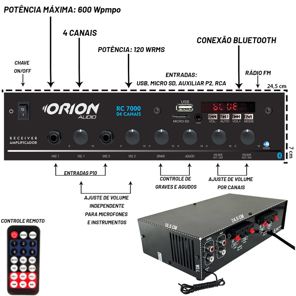 Mais de 15 anos de experiencia no mercado com os melhores produtos e o melhor atendimento! Compativel com ALEXA e GOOGLE ASSISTENTE Amplificador para som ambiente Bluetooth USB/FM/Micro SD/ 2 Entradas de Microfone - 125Wx4 Canais 4 Ohms + 4 Caixas de Som 4 polegadas 55W compacto para uso geral, desenvolvido pela Orion, com alto desempenho e qualidade de reproducao para todas as faixas de frequencia de audio. Possui Controles de volume independente, entrada auxiliar e entrada para 2 microfones. Ideal para completar qualquer projeto de som, seja em igrejas, escolas, hoteis, supermercados, bares, lojas, consultorios, etc. Voce pode ouvir suas musicas com muito mais qualidade. Esse amplificador tem 500 Watts de potencia maxima PMPO e conta com tensao bivolt para voce instalar com facilidade e garantir a execucao do som com mais qualidade. Ele conta com conexao USB, SD, RCA, FM e Bluetooth, alem de 2 entradas para microfone ou instrumentos musicais. Acompanha Controle remoto para trazer a comodidade de controlar seu som a distancia. Possui 4 saidas que suportam ate 16 auto falantes(consultar manual de instalacao para realizar a ligacao correta) Medidas: Largura : 25 Cm Profundidade : 12 Cm Altura : 7 Cm Receiver Mp3 Bluetooth Rc7000BT 500 Watts Saida Borne - Potencia: 125W Rms Potencia maxima PMPO: 500 W - Impedancia Minima: 4 Ohms -Duas Entradas P10 para microfones -Controle de Ganho individual dos Canais - 4 Canais de Saida de audio Borne -Entrada Para Cartao SD ,MMC ,USB - Receptor Bluetooth -1 Entrada RCA * IMPORTANTE: Nao ligar com a impedancia menor que 4 Ohms, ira danificar o aparelho. Recomendamos que a instalacao seja feita por um profissional* Caracteristicas tecnicas da caixa de som: . Cor: Preta . Woofer de 4 Polegadas . Potencia: 55W RMS . Impedancia: 8 Ohms . Sensibilidade: 84 Db . Resposta de frequencia: 37 a 20000Hz . Bobina simples . Carcaca em Plastico Resistente ABS . Dimensoes Aproximadas: 20,5x13x8 cm . Possui Ajuste de Direcao e Suporte multi-posicao . Otimo Acabamento FABRICANTE: ORION AUDIO Importante: A Orion Audio recomenda que a instalacao seja feita por um profissional especializado. Nao nos responsabilizamos por defeitos causados por mau uso.