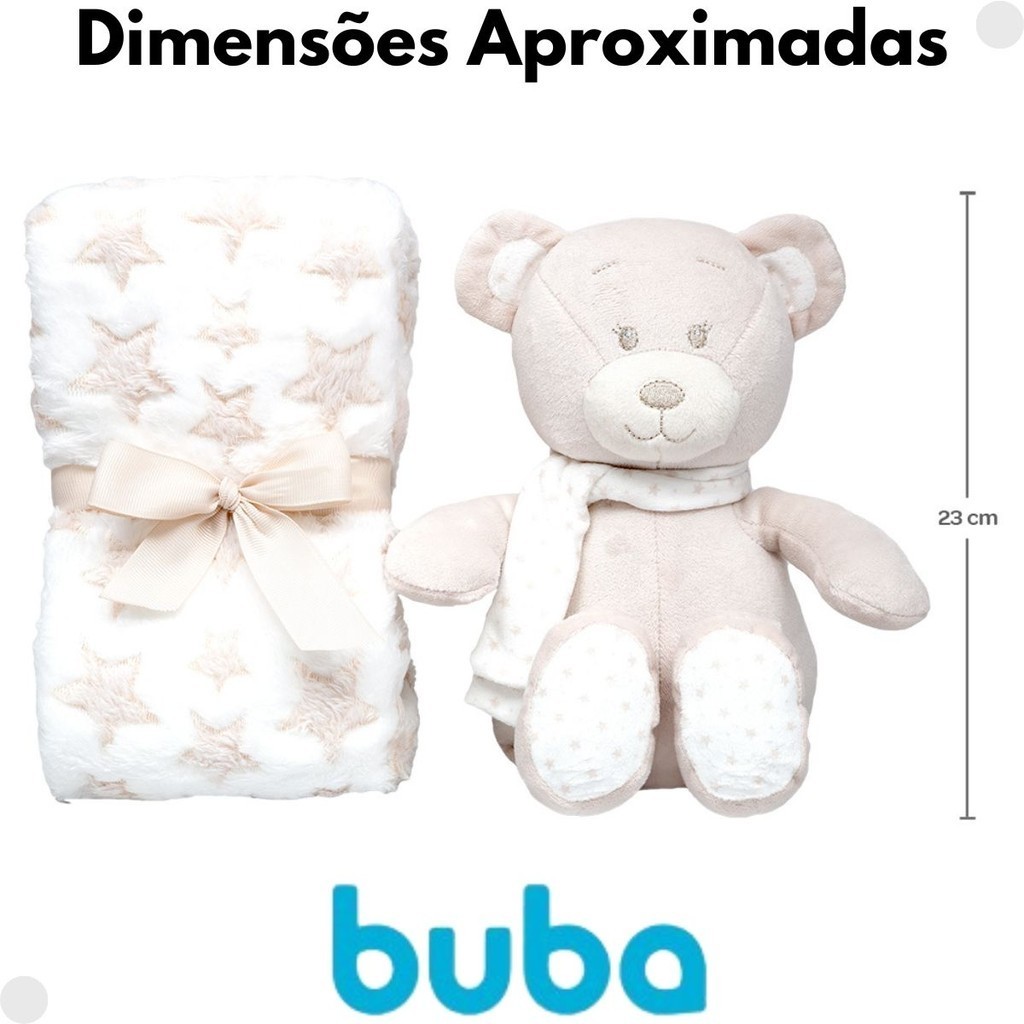 DESCRIÇÃO DO PRODUTO: O Kit Ursinho com Mantinha Soninho da Buba tem tudo o que seu pequeno precisa para uma noite tranquila. Com a mantinha Macia, seu bebê fica quentinho e aconchegado, enquanto o ursinho vai ser um companheiro inseparável. Pode ser usado no berço ou no carrinho. CARACTERÍSTICAS TÉCNICAS: Conteúdo da Embalagem: 1 Mantinha e 1 Pelúcia Dimensões Aproximadas do Produto: 23cm (Altura x Largura x Comprimento/Profundidade) Dimensões Aproximadas da Embalagem: 14 cm x 25 cm x 29 cm (Altura x Largura x Comprimento/Profundidade) Material/Composição: 100% Poliéster Idade Mínima Recomendada: A partir de 3 Meses Participantes: A partir de 1 pessoa Alimentação: Não se aplica Marca: Buba Referência: 18069 Outras informações: As cores podem variar entre as imagens mostradas acima e o produto. Imagens meramente ilustrativas. Aviso: As informações e imagens divulgadas são de total responsabilidade do fabricante/fornecedor. Produto lacrado e disponível a pronta entrega para todo Brasil! APROVADO PELO INMETRO