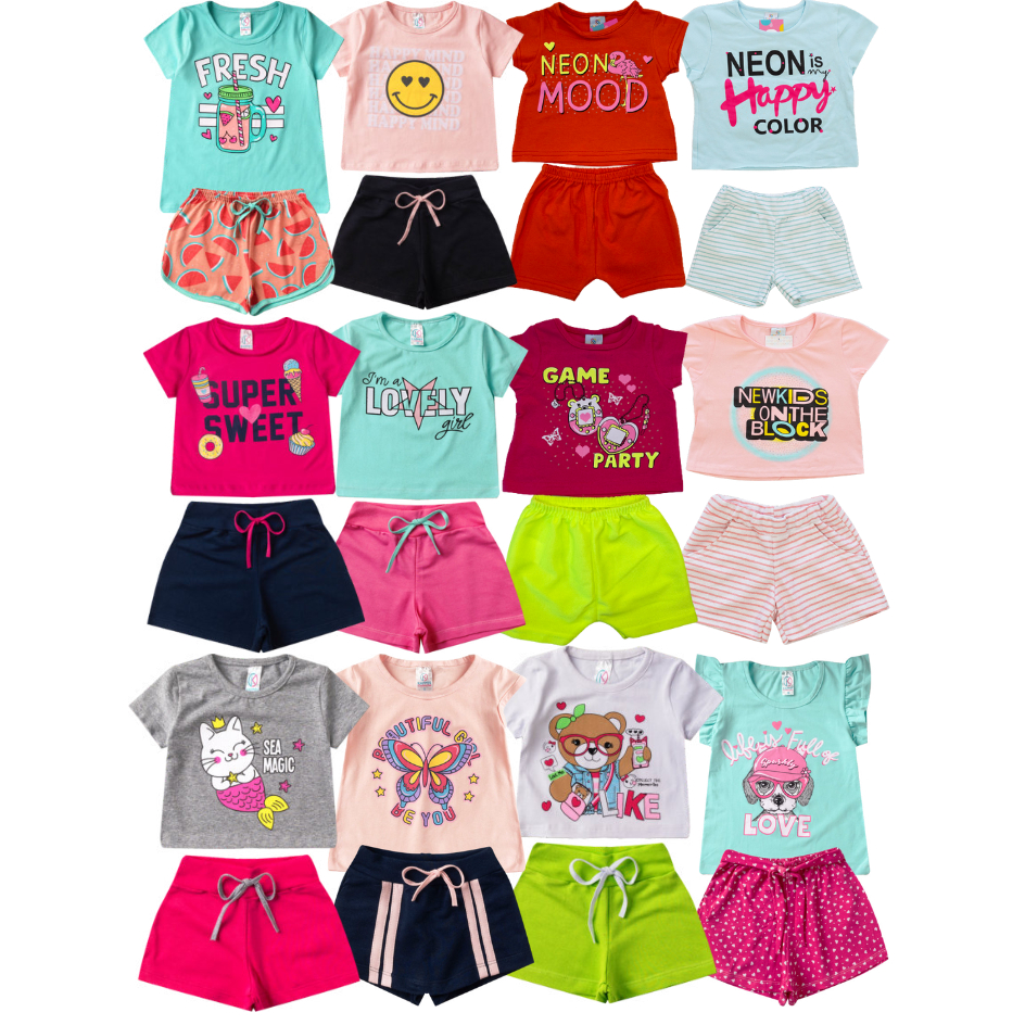 Kit Sortido 10 Peças de Roupas Infantil Menina - 5 Camisetas + 5 Bermudas - Promoção - Menina