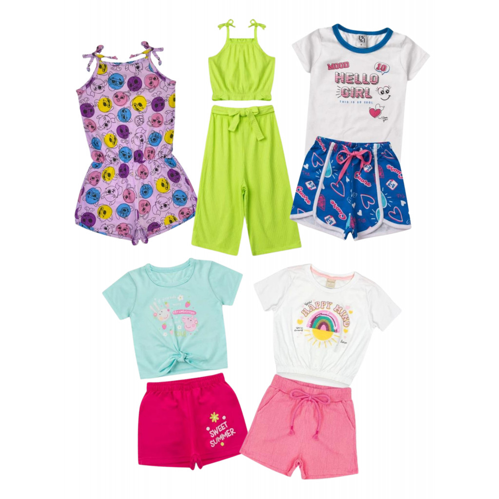 Kit Sortido 10 Peças de Roupas Infantis Feminina Verão - 5 Camisetas + 5 Bermudas
