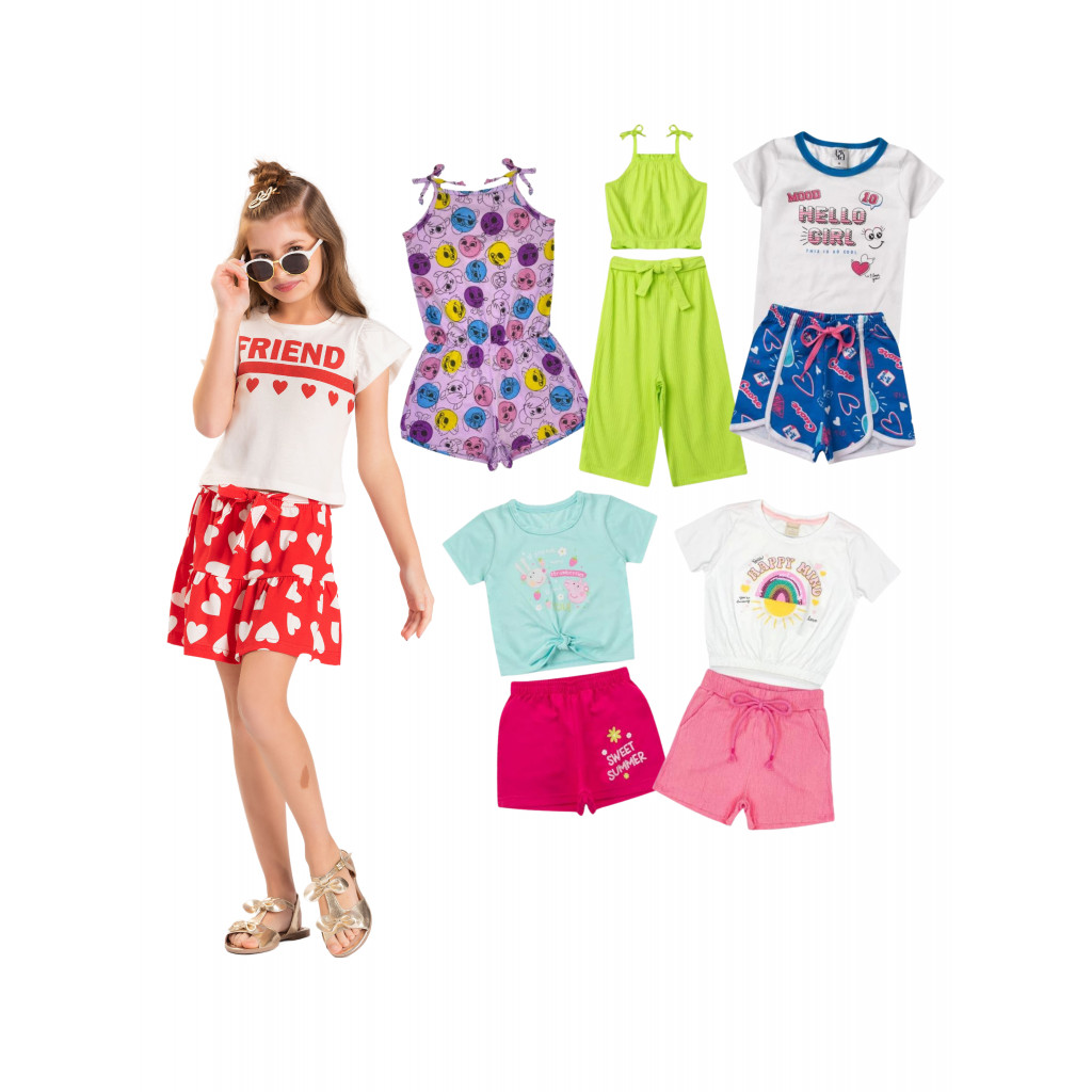 Descrição: Kit sortido 10 roupas infantis Feminina Kit com 5 conjuntos femininos (5 camiseta/regata + 5 shorts = 10 peças)(ou vestidos e macaquinhos) MATERIAL: Camiseta: Algodão (maioria é 100% algodãoo). Shorts: Moletinho e Tactel premium estampado. DÚVIDAS FREQUENTES: POSSO ESCOLHER DE TAMANHOS VARIADOS? RESPOSTA: Não, os conjuntos serão enviados no mesmo tamanho POSSO ESCOLHER AS ESTAMPAS ? RESPOSTA: Devido a rotatividade as estampas vão SORTIDAS e SEM REPETIR! Temos mais modelos do que nas fotos, mas sempre no mesmo estilo, conforto e qualidade. Selecionamos os melhores materiais para crianças que desejam ser destaque por onde passam! Guia de Tamanhos Como medir a criança? Utilizando uma fita métrica, envolva as regiões a serem medidas. Busto: Enrole a fita métrica em torno do corpo, na linha do peito. Comprimento: Comece pelo topo do ombro e meça até chegar no comprimento desejado. Quando for calça, short ou saia, comece medindo na linha da cintura. Cintura: Enrole a fita métrica em torno da cintura, sem apertar. As medidas da tabela abaixo são referentes á parte frontal da peça, então busto e cintura você deve multiplicar por 2. A tabela pode sofrer alterações de 1 á 2 cm para mais ou menos, leve isso em conta na hora de selecionar o tamanho adequado. Características: - Garantia: 1 Mês - Evento: Não - Estação: Verão - Tabela de Medidas: - Faixa Etária: 1 à 12 anos - Gênero: Feminino