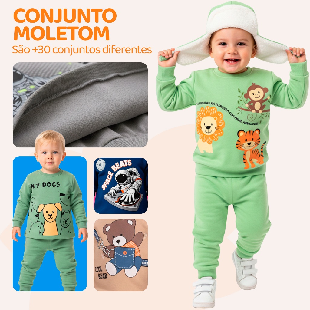 Este anúncio oferece duas opções de escolha para você personalizar o seu pedido: Kit com 2 conjuntos sortidos: Receba 4 peças no total ( Enviaremos 2 Casacos + 2 Calças de moletom, selecionadas de forma variada conforme nosso estoque disponível.) Kit com 6 conjuntos sortidos: Receba 12 peças no total ( Enviaremos 6 Casacos + 6 Calças de moletom, também selecionadas aleatoriamente, garantindo variedade e estilo!) ✅ Tecido Confortável: 60% algodão e 40% poliéster, garantindo maciez e conforto. ✅ Ajuste Perfeito: Ribana nos punhos e na barra para maior proteção contra o frio. ✅ Moletom Peluciado: Conforto e aquecimento extra nos dias frios. ✅ Estampas variadas e encantadoras: Muita praticidade e estilo em uma única compra. Sugestão de Tamanho por Idade: Tamanho 1: Indicado para 6 a 12 meses Tamanho 2: Ideal para 1 ano Tamanho 3: Ótimo para 2 anos Tamanho 4: Excelente para 3 anos Tamanho 6: Ideal para 4/5 anos Tamanho 8: Perfeito para 6/7 anos Tamanho 10: Excelente para 8/9 anos Os tamanhos podem variar de acordo com o biotipo/tamanho de cada criança. 👉 Consulte a tabela de medidas nas imagens, ou na guia de tamanho da Shopee. Envios em 24 horas 🚛 - Para todos os pedidos realizados antes das 13h. Garanta já o seu kit e proporcione o máximo de conforto e estilo para seu príncipe!