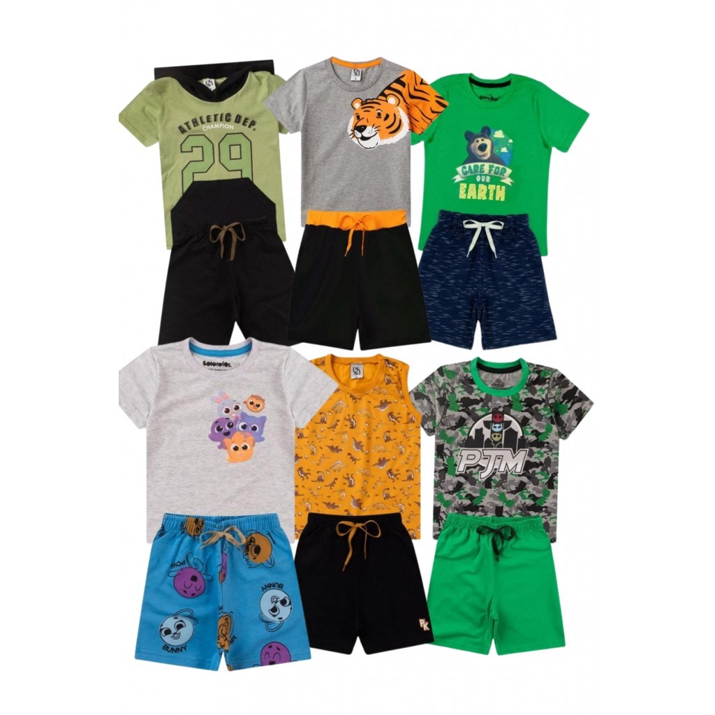 Kit Sortido 12 Peças de Roupas Infantis Masculino Verão - 6 Camisetas + 6 Bermudas