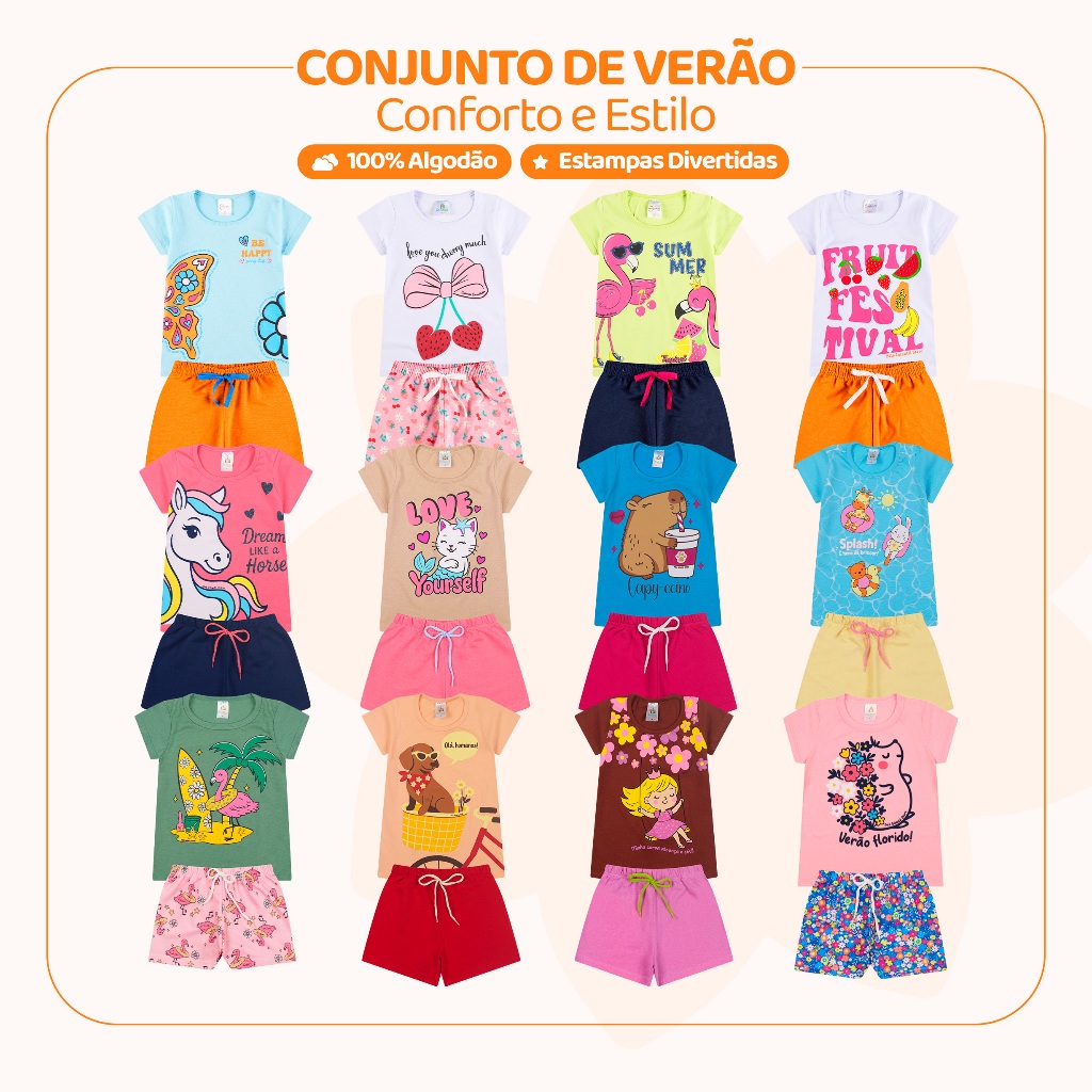 Kit Sortido de 6 Conjuntos Verão para Meninas! 👧✨ Perfeitos para dias quentes, passeios e momentos de lazer com sua princesa. ✅ Conjunto Completo: 6 camisetas + 6 bermudas. ✅ Camisetas e Regatas: Meia malha 100% algodão, e gola redonda com reforço. ✅ Shorts e Saias: Algodão com poliéster, e com elástico confortável na cintura. ✅ Estampas variadas e encantadoras: Muita praticidade e estilo em uma única compra. Sugestão de Tamanho por Idade: Tamanho 1: Indicado para 6 a 12 meses Tamanho 2: Ideal para 1 ano Tamanho 3: Ótimo para 2 anos Tamanho 4: Excelente para 3 anos Tamanho 6: Ideal para 4/5 anos Tamanho 8: Perfeito para 6/7 anos Tamanho 10: Excelente para 8/9 anos Os tamanhos podem variar de acordo com o biotipo/tamanho de cada criança. 👉 Consulte a tabela de medidas nas imagens, ou na guia de tamanho da Shopee. IMPORTANTE! ⚠️ Não há opção de escolha dos modelos. ⚠️ Os modelos enviados serão sortidos conforme a disponibilidade em estoque. ⚠️ Na compra de 2 kits do mesmo tamanho, não haverá repetição de cor ou estampa. Envios em 24 horas 🚛 - Para todos os pedidos realizados antes das 13h. Garanta já o seu kit e proporcione o máximo de conforto e estilo para sua princesa!