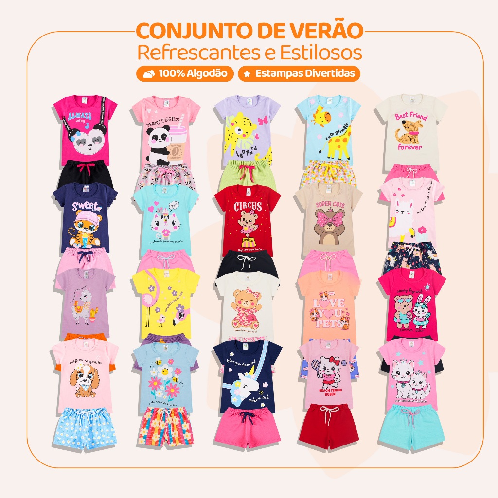 Esse anúncio é composto por 3 opções de kits: ✅ 16 Peças de Roupas Infantil Menina, composto por 8 Conjuntos sortidos por kit. 🌼 ✅ 10 Peças de Roupas Infantil Menina, composto por 5 Conjuntos sortidos por kit. 🌼 ✅ 4 Peças de Roupas Infantil Menina, composto por 2 Conjuntos sortidos por kit. 🌼 Uma coleção versátil e confortável para sua pequena princesa!. 👕🩳 👉Perfeitos para dias quentes, passeios e momentos de lazer com sua princesa! ✅ Camisetas e Regatas: Meia malha 100% algodão, e gola redonda com reforço. ✅ Bermudas: Moletinho 85% Algodão, com elástico confortável na cintura. ✅ Estampas variadas e encantadoras: Muita praticidade e estilo em uma única compra. Sugestão de Tamanho por Idade: Tamanho 1: Indicado para 6 a 12 meses Tamanho 2: Ideal para 1 ano Tamanho 3: Ótimo para 2 anos Tamanho 4: Excelente para 3 anos Tamanho 6: Ideal para 4/5 anos Tamanho 8: Perfeito para 6/7 anos Tamanho 10: Excelente para 8/9 anos Os tamanhos podem variar de acordo com o biotipo/tamanho de cada criança. 👉 Consulte a tabela de medidas nas imagens, ou na guia de tamanho da Shopee. IMPORTANTE! ⚠️ Não há opção de escolha dos modelos. ⚠️ Os modelos enviados serão sortidos conforme a disponibilidade em estoque. ⚠️ Na compra de 4 kits do mesmo tamanho, não haverá repetição de cor ou estampa. Envios em 24 horas 🚛 - Para todos os pedidos realizados antes das 13h. Garanta já o seu kit e proporcione o máximo de conforto e estilo para sua pequena princesa!