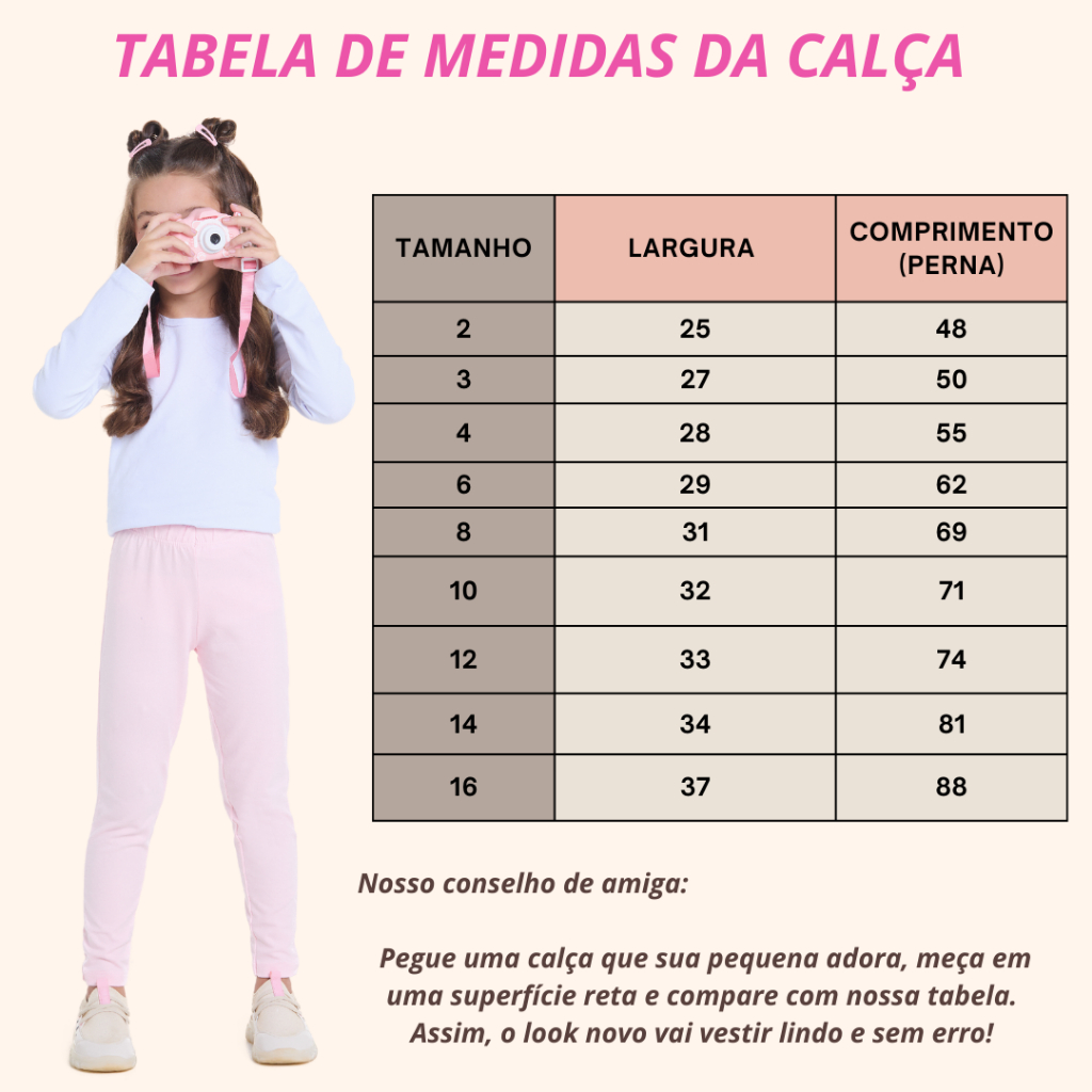 O Kit 4 leggings infantil de Cotton , peças de extrema Qualidade e conforto. A calça legging lisa infantil é uma peça essencial no guarda-roupa das crianças, perfeita para garantir conforto e estilo em diversas ocasiões. São confeccionadas em Cotton, possui 95% Algodão e 5% Elastano com Elástico na cintura proporcionando melhor ajuste e conforto para as pequenas. Tecido: Confeccionada em malha de alta elasticidade (como poliéster e elastano), oferecendo conforto e durabilidade. Benefícios: Fácil de vestir e combinar com outras peças. Leve e respirável, ideal para todas as estações do ano. Costuras reforçadas para maior durabilidade no dia a dia agitado das crianças. TABELA DE TAMANHOS Largura | Comprimento Tamanho 2 - 25 CM | 48 CM Tamanho 3 - 27 CM | 50 CM Tamanho 4 - 28 CM | 55 CM Tamanho 6 - 29 CM | 62CM Tamanho 8 - 31 CM | 69 CM Tamanho 10 - 32 CM | 71 CM Tamanho 12 - 33 CM | 74 CM Tamanho 14 - 34 CM | 81CM Tamanho 16 - 37 CM | 88 CM ✨ Quer garantir que a calça fique perfeita? Pegue uma que sua filha ama, estenda numa superfície reta e compare com nossa tabela de medidas. Assim, o look novo vai vestir como um abraço! 🤗 No Dia a Dia: Para momentos em casa, brincadeiras ou passeios informais. Combina bem com camisetas, blusinhas ou vestidos curtos. Na Escola: Ideal para a rotina escolar por ser confortável e permitir liberdade de movimento. Pode ser usada com tênis e moletom nos dias mais frios. Atividades Esportivas: Perfeita para educação física, aulas de dança, ginástica ou qualquer atividade que exija conforto e elasticidade. O Cotton proporciona um ajuste confortável sem irritar a pele da criança . Duvidas sobre cores ?? -- Entre em contato via chat, Vamos ajudar você Chega de Surpresas com calças de péssima qualidade que rasgam na primeira semana - Trabalhamos com Material Reforçado e Costuras PREMIUM em nossas Peças.