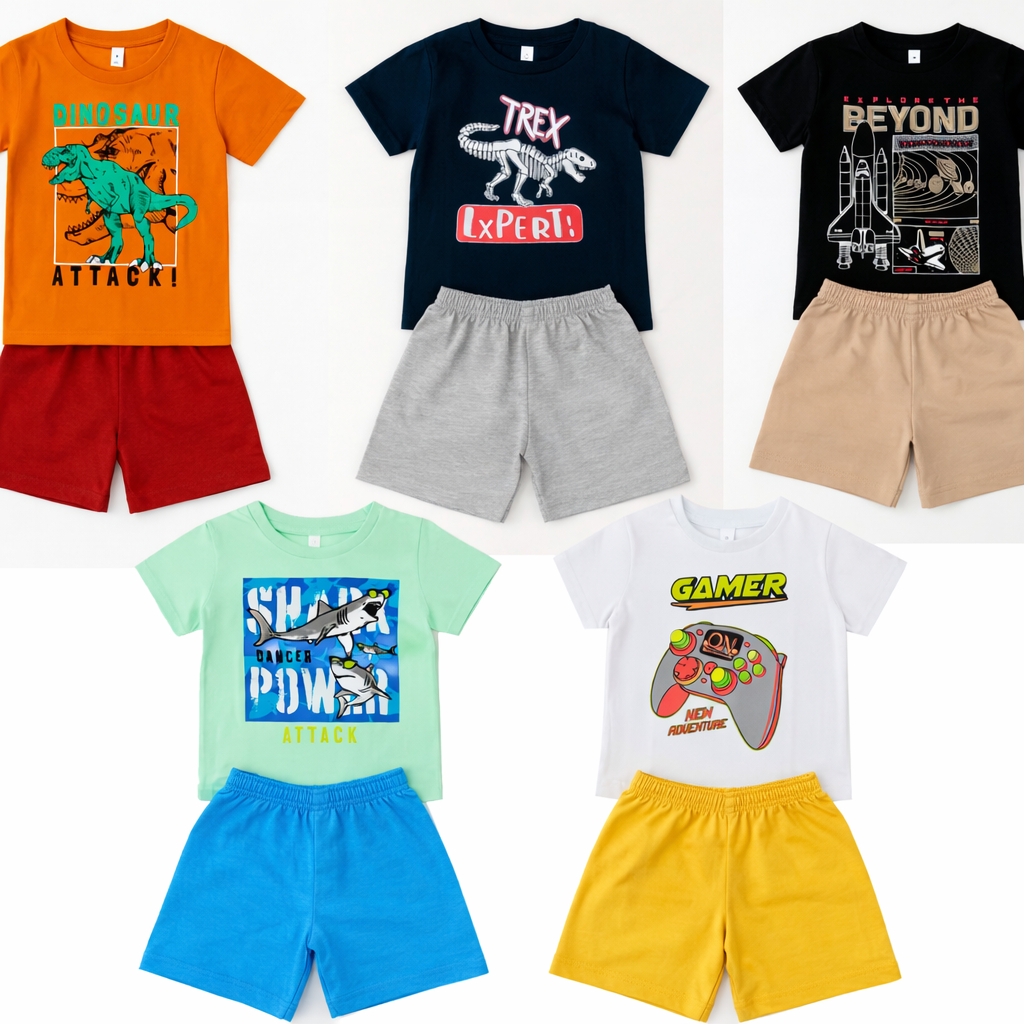 Kit Sortido 4 Peças de Roupas Infantil Menino Kit 2 Conjuntos Menino 2 Camisetas + 2 Bermudas Verão Masculino Juvenil