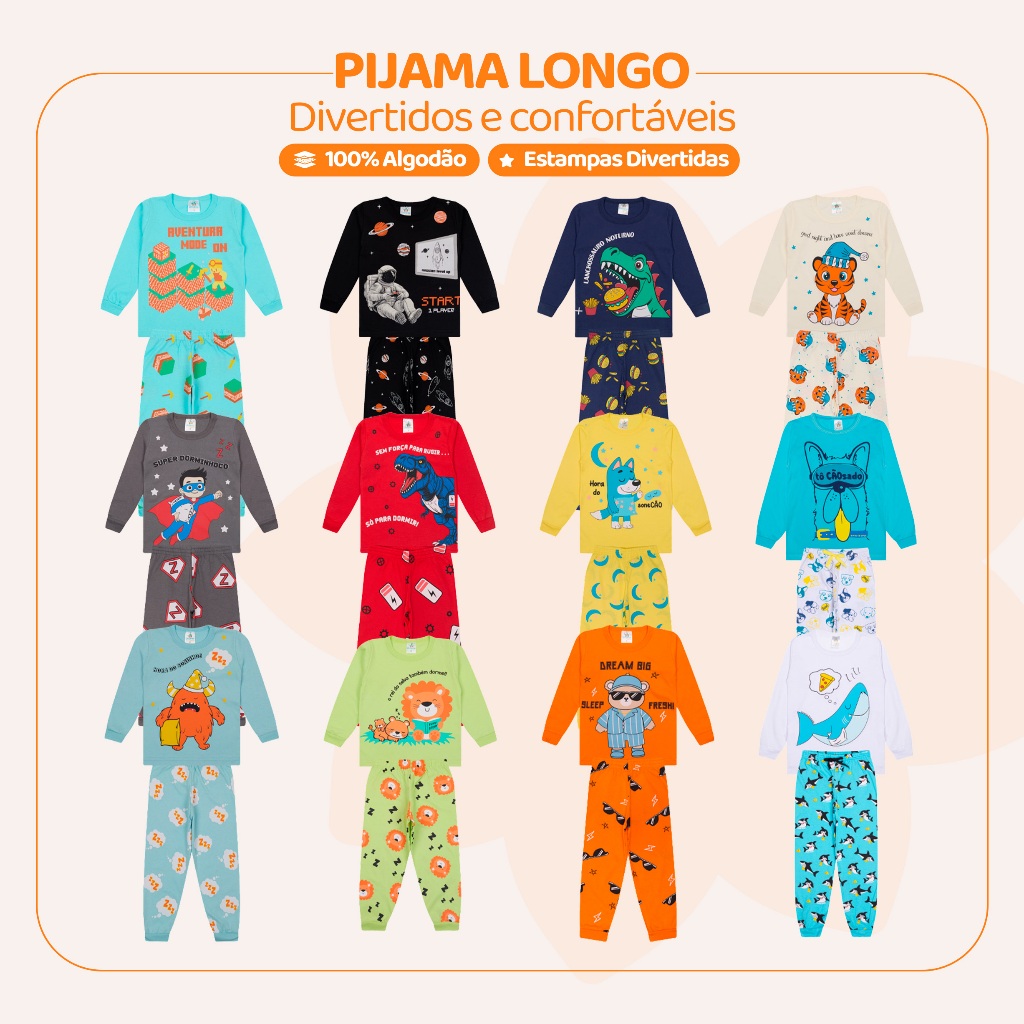 Kit Sortido 2 Pijamas Longos para Meninos! Perfeito para garantir noites aconchegantes e tranquilas para os pequenos. ✅ Pijama Completo: 2 camisetas manga longa + 2 calças. ✅ Estampas variadas e divertidas, que proporcionam estilo para os pequenos. ✅ Confeccionados 100% algodão, para garantir maior conforto durante o sono. Sugestão de Tamanho por Idade: Tamanho 1: Indicado para 6 meses a 1 ano Tamanho 2: Ideal para 1 ano Tamanho 3: Ótimo para 2 anos Tamanho 4: Excelente para 3 anos Tamanho 6: Ideal para 4/5 anos Tamanho 8: Perfeito para 6/7 anos Tamanho 10: Excelente para 8/9 anos Os tamanhos podem variar de acordo com o biotipo/tamanho de cada criança. 👉 Consulte a tabela de medidas nas imagens, ou na guia de tamanho da Shopee. IMPORTANTE! ⚠️ Não há opção de escolha dos modelos. ⚠️ Os modelos enviados serão sortidos conforme a disponibilidade em estoque. ⚠️ Na compra de 6 kits do mesmo tamanho, pode haver repetição de cor ou estampa. Envios em 24 horas 🚛 - Para todos os pedidos realizados antes das 13h. Garanta já o seu kit e proporcione o máximo de conforto e estilo para seu príncipe!