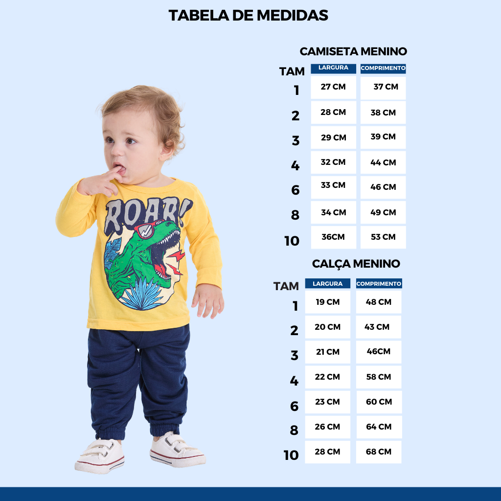 Kit Sortidos 4 Conjuntos Meia Estação para Bebê Menino! 👕🩳 Ideal para manter seus pequenos confortáveis e estilosos em qualquer ocasião! ✅ Conjunto Meia Estação Completo: 4 camisetas manga longa + 4 calças. ✅ Camisetas Manga Longa: Meia malha 100% algodão, maciez e conforto ao toque. ✅ Calças: Mínimo 60% Algodão, com punho elástico na barra e elástico na cintura. ✅ Estampas variadas e encantadoras: Muita praticidade e estilo em uma única compra. Sugestão de Tamanho por Idade: Tamanho 1: Indicado para 6 a 12 meses Tamanho 2: Ideal para 1 ano Tamanho 3: Ótimo para 2 anos Tamanho 4: Excelente para 3 anos Tamanho 6: Ideal para 4/5 anos Tamanho 8: Perfeito para 6/7 anos Tamanho 10: Excelente para 8/9 anos Os tamanhos podem variar de acordo com o biotipo/tamanho de cada criança. 👉 Consulte a tabela de medidas nas imagens, ou na guia de tamanho da Shopee. IMPORTANTE! ⚠️ Não há opção de escolha dos modelos. ⚠️ Os modelos enviados serão sortidos conforme a disponibilidade em estoque. ⚠️ Na compra de múltiplos kits do mesmo tamanho, poderá haver repetição de cor ou estampa. Envios em 24 horas 🚛 - Para todos os pedidos realizados antes das 13h. Garanta já o seu kit e proporcione o máximo de conforto e estilo para seu príncipe!