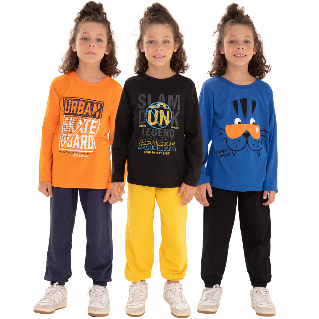 Apresentamos nosso adorável Kit de 4 Conjuntos Meia Estação para Meninos, ideal para manter seus pequenos confortáveis e estilosos em qualquer ocasião! Cada conjunto é cuidadosamente confeccionado com materiais de alta qualidade: As Camisas manga longa são feitas em meia malha 100% algodão, oferecendo maciez e conforto ao toque. Com estampas exclusivas e divertidas, adicionam um toque de charme ao visual dos meninos. As calças são confeccionadas em moletinho com no mínimo 60% algodão, garantindo conforto e durabilidade. Com punho de elástico na barra e elástico na cintura, proporcionam um ajuste perfeito ao corpo, além de possuírem cordão decorativo e modelagem padrão para um visual despojado. Não perca a oportunidade de adquirir nosso Kit de 3 Conjuntos Meia Estação para Meninos e garantir o melhor em termos de estilo e conforto para seus pequenos! Escolha entre uma variedade de conjuntos e renove o guarda-roupa dos meninos com praticidade e qualidade. Tamanhos que Acompanham o Crescimento: Tamanho 2: Perfeito para 1 ano Tamanho 3: Ótimo para 2 anos Tamanho 4: Excelente para 3 anos Tamanho 6: Ideal para 4/5 anos Tamanho 8: Perfeito para 6/7 anos Tamanho 10: Excelente para 8/9 anos Descubra nosso Kit Sortido com amor e estilo! Não é possível escolher modelos, mas não se preocupe, todos são lindos e feitos com carinho. Além das fotos, temos outras opções igualmente encantadoras esperando por você! Na compra de 1 kit, você receberá modelos diferentes e variados, sem repetições. No entanto, ao comprar múltiplos kits, pode haver a possibilidade de algumas estampas se repetirem. Mas fique tranquilo, todas as peças são igualmente encantadoras e de alta qualidade, garantindo que seu pequeno fique sempre estiloso e confortável. Estamos com estoque disponível e prontos para enviar o seu pedido com agilidade! Garanta agora o seu kit e receba rapidamente em sua casa!