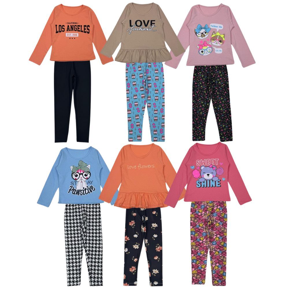 Kit Sortido 8 Peças de Roupas Feminino Infantil Meia Estação 4 Blusas manga longa e 4 Leggings