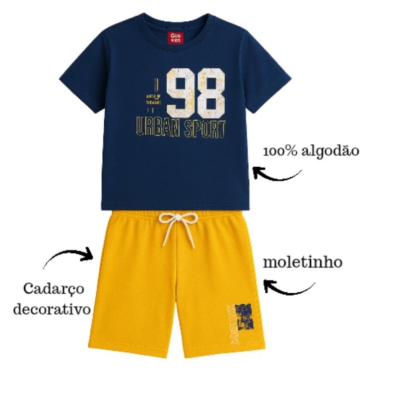 Lote com 5 Conjuntos SORTIDOS - Kit 10 Peças sendo 5 Camisetas + 5 Bermudas. A camiseta é confeccionada em meia malha 100% algodão, gola redonda com reforço, possui manga curta e regata. A bermuda é feita em moletinho 100% algodão, elástico confortável na cintura. O conjunto é fabricado essencialmente com algodão em suas composições, garantindo resistência, maciez e conforto. É ideal para dias mais quentes, passeios e momentos de lazer, além de versátil e prático. Não perca essa oportunidade de lançamento na Uniduni Kids e garanta seu Kit conjunto agora mesmo. KIT COM 5 CONJUNTOS (5 BERMUDAS E 5 CAMISETAS) Tamanhos de 10 anos a 16 anos de idade. Os tamanhos recomendados acima podem variar de acordo com o biotipo/tamanho de cada criança. Por isso, recomendamos também conferir a tabela de medidas. • Tabela de Medidas: * ATENÇÃO ENVIAREMOS MODELOS VARIADOS CONFORME DISPONIBILIDADE EM ESTOQUE * NÃO TEM OPÇÃO DE ESCOLHA * CONFIRA A TABELA DE MEDIDAS PARA SABER O TAMANHO IDEAL * TAMANHO DO CONJUNTO NÃO QUER DIZER A IDADE DA CRIANÇA * CAMISETA 100% ALGODÃO * BERMUDA MOLETINHO 85% ALGODÃO *PARA ATÉ DOIS KIT DO MESMO TAMANHO, GARANTIMOS QUE NÃO VAI REPETIDO. PARA MAIS KITS ADQUIRIDOS DO MESMO TAMANHO PODE REPETIR COR OU ESTAMPA*