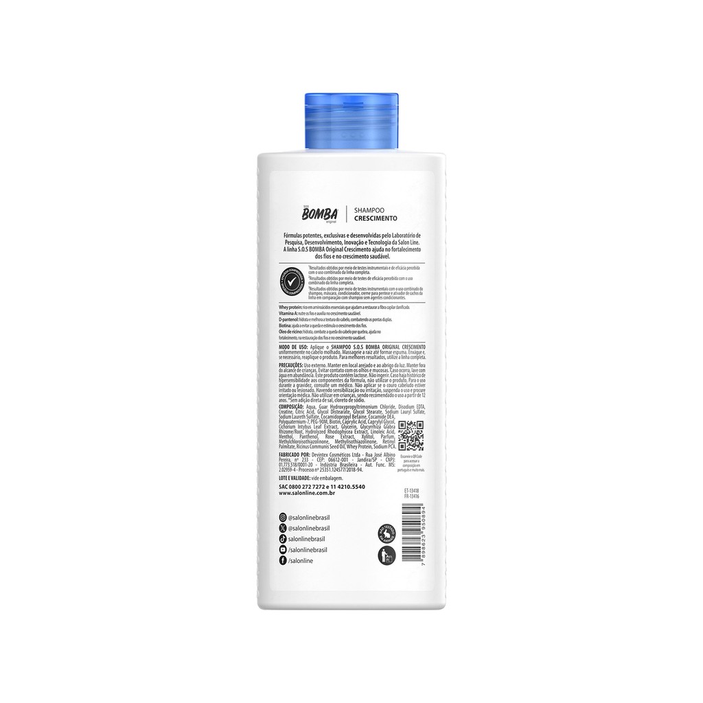 O Kit S.O.S Bomba conta com o Shampoo e condicionador S.O.S Bomba Original e 2 Tônicos Fortalecedor S.O.S Bomba que, juntos, proporcionam fios mais saudáveis e fortes da raiz às pontas. Desenvolvidos com ativos inovadores, apresenta crescimento dos cabelos comprovado em até 30 dias de uso. INDICAÇÕES Para quais tipos de cabelo? Para todos os tipos de cabelos. Qual a indicação? Cabelos fracos e quebradiços. Pode usar a partir de quantos anos? A partir de 12 anos. ATIVOS Quais os principais ativos? Shampoo S.O.S Bomba Original Whey protein: rico em aminoácidos essenciais que restauram a fibra capilar danificada. Vitamina A: fortalece os fios e auxilia no crescimento capilar saudável. D-pantenol: hidrata e melhora a textura da fibra, combatendo as pontas duplas. Biotina: ajuda a prevenir a queda, estimula o crescimento e fortalece os fios. Óleo de rícino: hidrata, combate a queda por quebra, fortalece e recupera profundamente os fios, além de auxiliar no crescimento saudável. Tônico Fortalecedor S.O.S Bomba Whey protein: rico em aminoácidos essenciais que restauram a fibra capilar danificada. Biotina: ajuda a prevenir a queda, estimula o crescimento e fortalece os fios. Cafeína: estimula o crescimento saudável dos fios. MODO DE USO Qual a melhor forma de usar? Saiba como aplicar cada um dos produtos: Shampoo S.O.S Bomba Original: aplique uniformemente o Shampoo S.O.S Bomba Original no cabelo molhado. Massageie a raiz até formar espuma. Enxágue. Condicionador S.O.S Bomba Original: depois de lavar o cabelo com o shampoo, aplique o Condicionador S.O.S Bomba Original no comprimento e nas pontas. Deixe agir entre 1 e 3 minutos e enxágue. Tônico Fortalecedor S.O.S Bomba: depois de lavar o cabelo, aplique o Tônico Fortalecedor S.O.S Bomba no couro cabeludo e faça massagens circulares. Não precisa enxaguar. CARACTERÍSTICAS É produto vegano? O Shampoo e condicionador S.O.S Bomba Original e o Tônico Fortalecedor S.O.S Bomba não são veganos. É liberado? O Shampoo e condicionador S.O.S Bomba Original não são liberados. O Tônico Fortalecedor S.O.S Bomba é liberado.