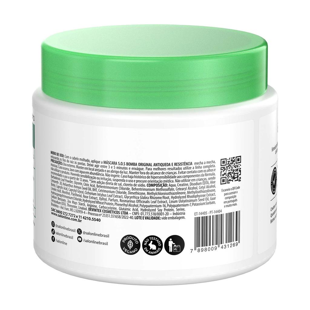 O kit contém 1 Shampoo 300ml e 1 Condicionador 200ml SOS Bomba Antiqueda e 1 Máscara de Hidratação SOS Bomba Antiqueda 500g, a combinação ideal para fortalecer os fios, combater a queda e promover hidratação profunda, garantindo cabelos mais saudáveis, resistentes e cheios de vitalidade. <>INDICAÇÕES$& Para quais tipos de cabelo? Para todos os tipos de cabelo. Qual a indicação? fragilizado, danificado, com queda e com pontas duplas. Pode usar a partir de quantos anos? A partir de 12 anos. <>ATIVOS$& Quais os principais ativos? Kit Shampoo 300ml + Condicionador 200ml e Máscara SOS Bomba Antiqueda A biotina ajuda a reduzir a queda e estimula o crescimento capilar. A creatina fortalece e restaura os fios. Já a queratina vegetal hidrata profundamente e auxilia na reconstrução dos cabelos. <>MODO DE USO$& Qual a melhor forma de usar? Kit Shampoo 300ml + Condicionador 200ml SOS Bomba Antiqueda Shampoo S.O.S Bomba Antiqueda Aplique o shampoo no cabelo úmido, massageie e enxágue. Se necessário, repita a aplicação. Condicionador S.O.S Bomba Antiqueda Aplique o produto no cabelo úmido e espalhe uniformemente. Deixe agir entre 1 e 3 minutos. Enxágue bem por toda a extensão dos fios. Máscara de hidratação SOS Bomba Antiqueda Com o cabelo molhado, aplique a Máscara Hidratante S.O.S Bomba Antiqueda mecha a mecha, enluvando os fios da raiz às pontas. Deixe agir entre 3 e 5 minutos e enxágue. <>CARACTERÍSTICAS$& É produto vegano? Os produtos são veganos. É liberado? Apenas a Máscara SOS Bomba Antiqueda é liberada.