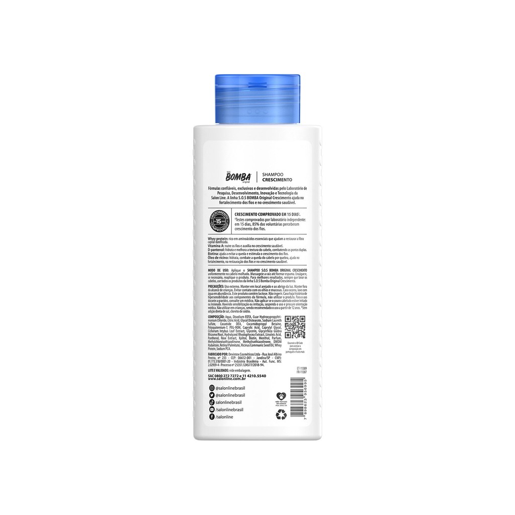 O Kit S.O.S Bomba Original conta com o Shampoo S.O.S Bomba Original, o Condicionador S.O.S Bomba Original e 2 unidades do Tônico Fortalecedor S.O.S Bomba que, juntos, proporcionam fios mais saudáveis e fortes da raiz às pontas. Desenvolvidos com ativos inovadores, apresentam resultados comprovados em até 30 dias de uso. O Tônico Fortalecedor pode ainda ser usado nas sobrancelhas para auxiliar os pelos a crescerem fortes e saudáveis. INDICAÇÕES Para quais tipos de cabelo? Para todos os tipos de cabelo. Qual a indicação? Cabelos fragilizados, cabelos danificados e quebradiços. Pode usar a partir de quantos anos? A partir de 12 anos. ATIVOS Quais os principais ativos? Shampoo S.O.S Bomba Original e Condicionador S.O.S Bomba Original Whey protein: rico em aminoácidos essenciais que restauram a fibra capilar danificada. Vitamina A: fortalece os fios e auxilia no crescimento saudável. D-pantenol: hidrata e melhora a textura da fibra, combatendo as pontas duplas. Biotina: ajuda a prevenir a queda, estimula o crescimento e fortalece os fios. Óleo de rícino: hidrata, combate a queda por quebra, fortalece e recupera profundamente os fios, além de auxiliar no crescimento saudável. Tônico Fortalecedor S.O.S Bomba Whey protein: rico em aminoácidos essenciais que restauram a fibra capilar danificada. Biotina: ajuda a prevenir a queda, estimula o crescimento e fortalece os fios. Cafeína: estimula o crescimento saudável dos fios. MODO DE USO Qual a melhor forma de usar? Cada produto do kit possui sua forma correta de uso. Anota aí: Shampoo S.O.S Bomba Original: aplique uniformemente o Shampoo S.O.S Bomba Original no cabelo molhado. Massageie a raiz até formar espuma. Enxágue. Condicionador S.O.S Bomba Original: depois de lavar o cabelo com o shampoo para crescimento capilar, aplique o Condicionador S.O.S Bomba Original no comprimento e nas pontas. Deixe agir entre 1 e 3 minutos e enxágue. Tônico Fortalecedor S.O.S Bomba: Couro cabeludo: depois de lavar o cabelo, aplique o Tônico Fortalecedor S.O.S Bomba no couro cabeludo e faça massagens circulares. Não precisa enxaguar. Aproveite e aplique o produto nas sobrancelhas, massageando a região. Sobrancelha: aplique o Tônico Salon Line fortalecedor de cabelo diariamente nas sobrancelhas e faça massagens circulares. Não precisa enxaguar. CARACTERÍSTICAS É produto vegano? O Shampoo, o Condicionador e o Tônico Fortalecedor da linha S.O.S Bomba Original não são veganos. É liberado? O Shampoo e o Condicionador S.O.S Bomba Original não são liberados. O Tônico Fortalecedor S.O.S Bomba é liberado.