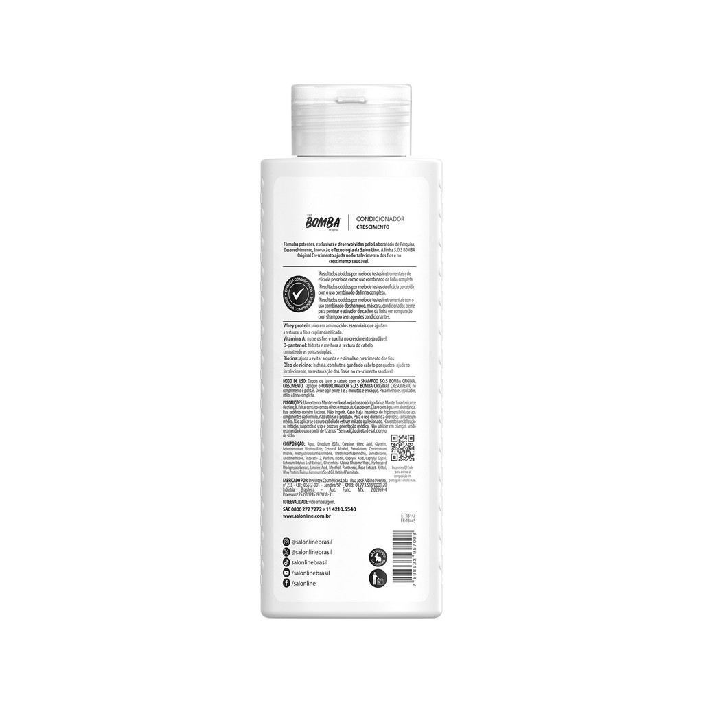 O kit conta com o Shampoo S.O.S Bomba Original, o Condicionador S.O.S Bomba Original e o Tônico Fortalecedor S.O.S Bomba que, juntos, proporcionam fios mais saudáveis e fortes da raiz às pontas. Desenvolvidos com ativos inovadores, apresentam resultados comprovados em até 30 dias de uso. O Tônico pode ainda ser usado nas sobrancelhas para auxiliar os pelos a crescerem fortes e saudáveis. INDICAÇÕES Para quais tipos de cabelo? Para todos os tipos de cabelo. Qual a indicação? Cabelos fragilizados, cabelos danificados e quebradiços. Pode usar a partir de quantos anos? A partir de 12 anos. ATIVOS Quais os principais ativos? Shampoo S.O.S Bomba Original e Condicionador S.O.S Bomba Original Whey protein: rico em aminoácidos essenciais que restauram as fibras capilares danificadas. Vitamina A: fortalece os fios e auxilia no crescimento capilar saudável. D-pantenol: hidrata e melhora a textura da fibra, combatendo as pontas duplas. Biotina: ajuda a prevenir a queda, estimula o crescimento e fortalece os fios. Óleo de rícino: hidrata, combate a queda de cabelo por quebra, fortalece e recupera profundamente os fios, além de auxiliar no crescimento saudável. Tônico Fortalecedor S.O.S Bomba Whey protein: rico em aminoácidos essenciais que restauram a fibra capilar danificada. Biotina: ajuda a prevenir a queda dos fios, estimula o crescimento e fortalece os cabelos. Cafeína: estimula o crescimento saudável dos fios. MODO DE USO Qual a melhor forma de usar? Cada produto do kit possui sua forma correta de uso. Anota aí: Shampoo S.O.S Bomba Original: aplique uniformemente o Shampoo S.O.S Bomba Original no cabelo molhado. Massageie a raiz até formar espuma. Enxágue. Condicionador S.O.S Bomba Original: depois de lavar o cabelo com o Shampoo S.O.S Bomba, aplique o Condicionador S.O.S Bomba Original no comprimento e nas pontas. Deixe agir entre 1 e 3 minutos e enxágue. Tônico Fortalecedor S.O.S Bomba: Couro cabeludo: depois de lavar o cabelo, aplique o Tônico Fortalecedor S.O.S Bomba no couro cabeludo e faça massagens circulares. Não precisa enxaguar. Aproveite e aplique o produto nas sobrancelhas, massageando a região. Sobrancelha: aplique o Tônico Salon Line fortalecedor de cabelo diariamente nas sobrancelhas e faça massagens circulares. Não precisa enxaguar. CARACTERÍSTICAS É produto vegano? O Shampoo, o Condicionador e o Tônico Fortalecedor da linha S.O.S Bomba Original não são veganos. É liberado? O Shampoo e o Condicionador S.O.S Bomba Original não são liberados. O Tônico Fortalecedor S.O.S Bomba é liberado.
