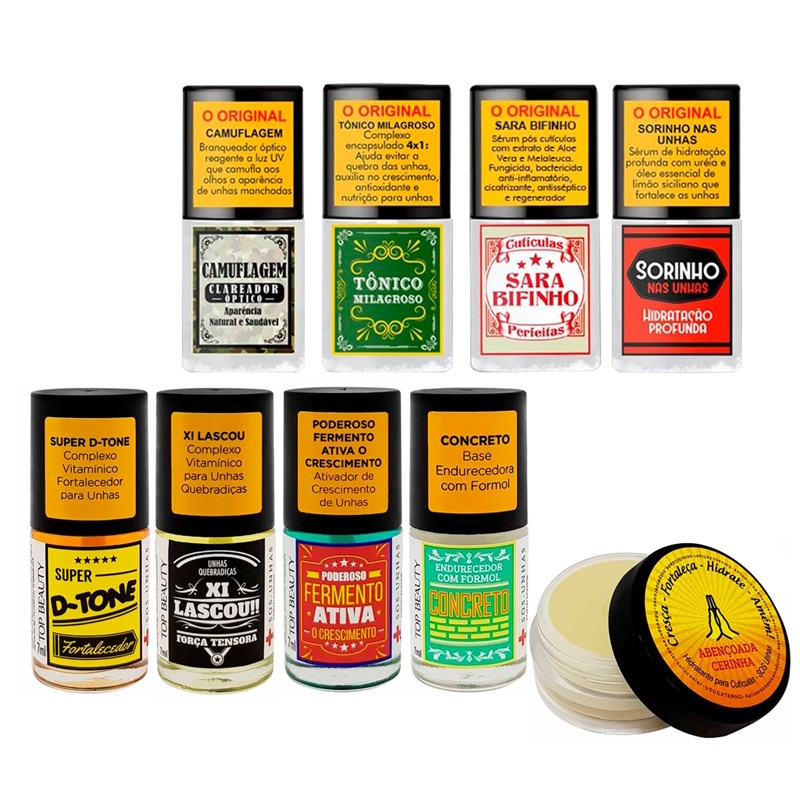 Kit SOS Completo 8 tratamentos + Cerinha Top BeautyO kit contém 10 unidades sendo eles: Xi lascou D-tone fermento Concreto Abençoada Cerinha Tônico Milagroso camuflagem Sorinho Sara bifinho A Top Beauty especializada no ramo de cosméticos, atua no mercado desde 2005 sendo referência em produtos de beleza de extrema qualidade e preço justo. O objetivo de levar a beleza e confiança para a casa das brasileiras proporciona a excelência de seus produtos. A marca Top Beauty contribui para um viés cruelty-free, assim garantimos que os produtos comercializados não são testados em animais. Sendo assim SÓ a Top Beauty proporciona a você, a alta qualidade de seus produtos, aquela make duradoura, arrasadora que destaca sua beleza e cuida da sua pele. Além disso, a marca trás versatilidade podendo ser utilizada tanto no dia-dia quanto em ocasiões mais especiais. Sua durabilidade, marca presença em todas as situações permitindo que você se destaque sempre.