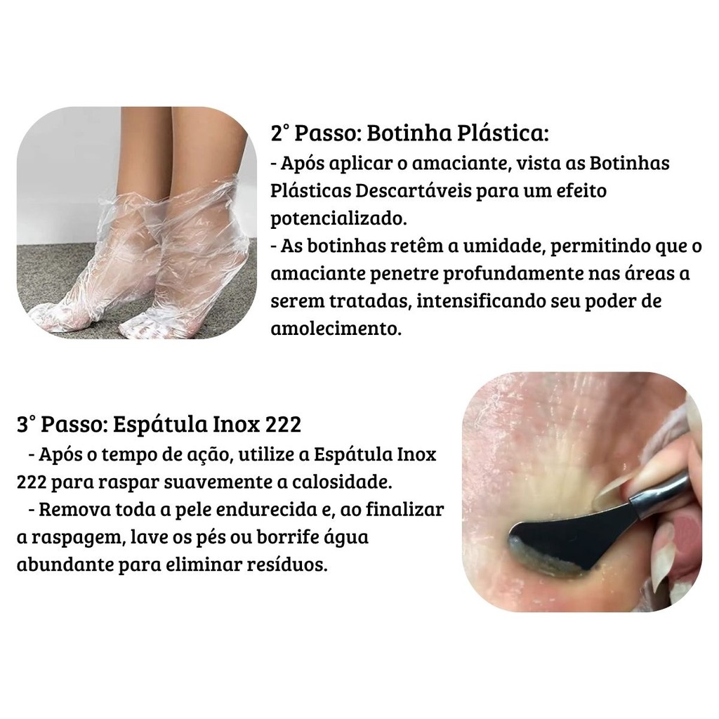 Neste kit você vai receber os seguintes itens: - 1Und Amaciante Repos 150ml - 1Und Espátula 222 - 10Und Botinhas Descartáveis - 1Und Pedra Pomes Simples O Kit “Spa dos Pés com Pedra Pomes” traz a combinação perfeita para renovar e hidratar a pele dos seus pés! Ele inclui um Amaciante de Cutículas, essencial para amolecer as cutículas e facilitar a remoção de cutículas e calosidades; uma Botinha Descartável, que potencializa o efeito do amaciante ao mantê-lo em contato com a pele por mais tempo; a Espátula Inox para Calosidade Plantar 222, que remove eficazmente a pele morta e facilita a renovação da pele; e a Pedra Pomes, perfeita para esfoliar e dar maciez aos seus pés, deixando-os lisinhos e saudáveis. Modo de Uso: Preparação do Espaço - Antes de iniciar o procedimento, higienize o local onde será realizado o Spá dos Pés para garantir um ambiente limpo e seguro. 1° Passo: Amaciante de Cutículas e Calosidades - Aplique o Amaciante de Cutículas e Calosidades na região a ser tratada, formulado especialmente para suavizar e facilitar a remoção de áreas mais endurecidas. - Para Cutículas aplicar uma gota e aguardar de 10 a 20 segundos. - Para Calosidades aplicar na área desejada e aguardar 3 minutos dependendo da sensibilidade. - Regiões com excesso de Calosidade coloque algodão em cima do Amaciante, borrife água e utilize a botinha descartável. 2° Passo: Botinhas Plásticas Descartáveis - Após aplicar o amaciante, vista as Botinhas Plásticas Descartáveis para um efeito potencializado. - As botinhas retêm a umidade, permitindo que o amaciante penetre profundamente nas áreas a serem tratadas, intensificando seu poder de amolecimento. 3° Passo: Espátula em Aço Inox 222 para Calosidade Plantar - O último passo é a utilização da Espátula em Aço Inox 222, projetada para uma remoção eficiente e segura das calosidades. - Com uma lâmina levemente afiada, esta espátula é ideal para áreas mais rígidas, como a planta dos pés, oferecendo precisão e praticidade. - Use-a com movimentos delicados para remover as áreas endurecidas e finalizar o tratamento com suavidade e cuidado. - Após o término do procedimento remova o excesso do produto com água. 4° Passo: Pedra Pomes Simples Por fim, finalize com a pedra pomes, massageando em movimentos circulares para esfoliar e deixar seus pés ainda mais macios.
