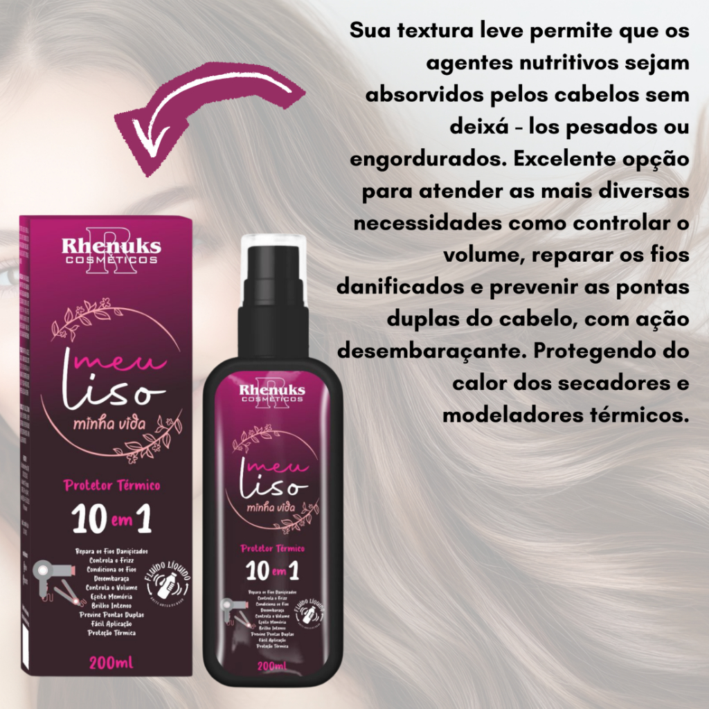 Descrição Meu Liso Minha Vida Protetor Térmico * Repara os fios danificados * Controle de frizz * Condiciona os fios * Desembaraça * Controle de volume * Efeito memória * Brilho intenso * Previne pontas duplas * Fácil aplicação * Proteção térmica