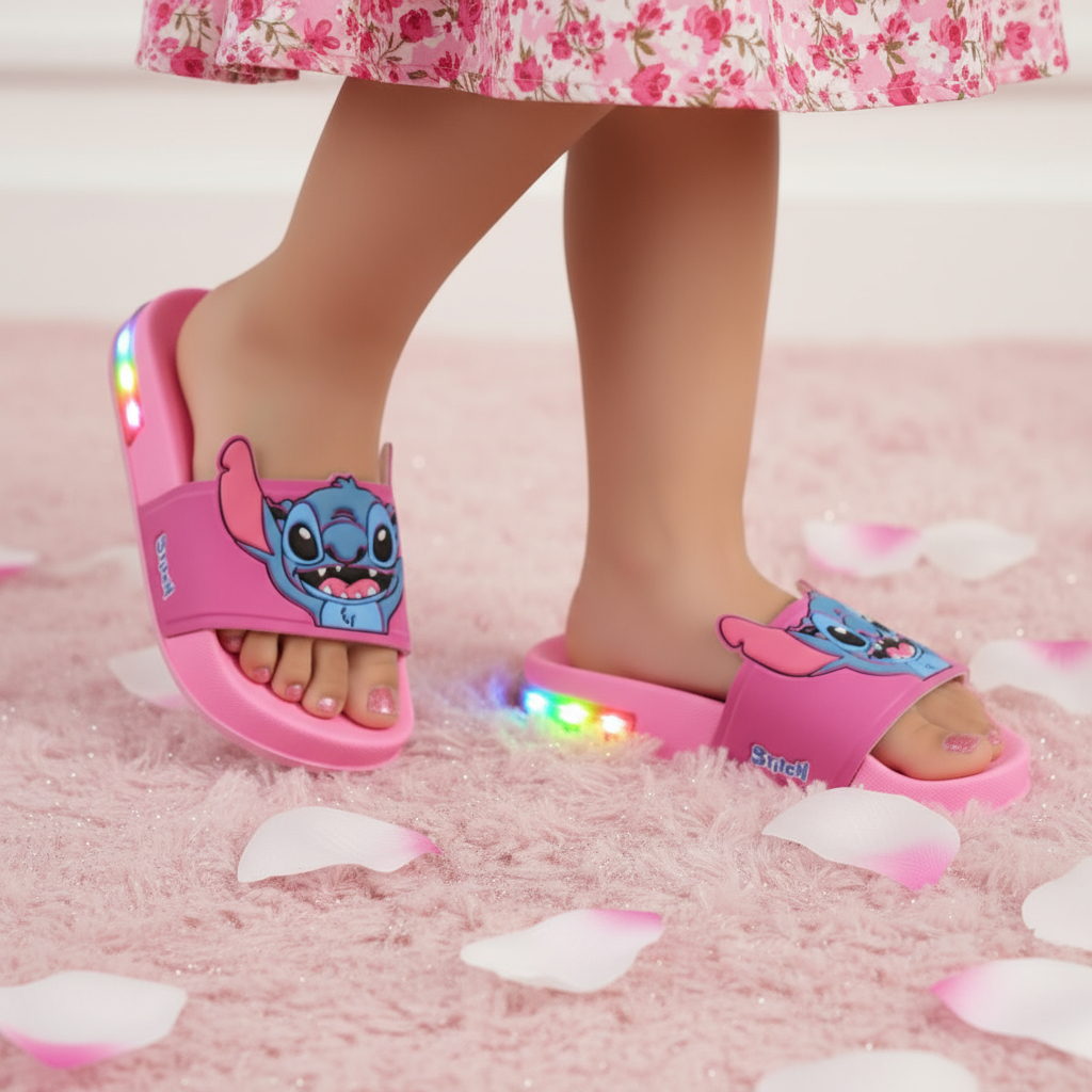 Kit Stitch Infantil LED: Chinelo infantil Slide Luzinha, Óculos, Bolsa e Relógio – Brilho + Diversão