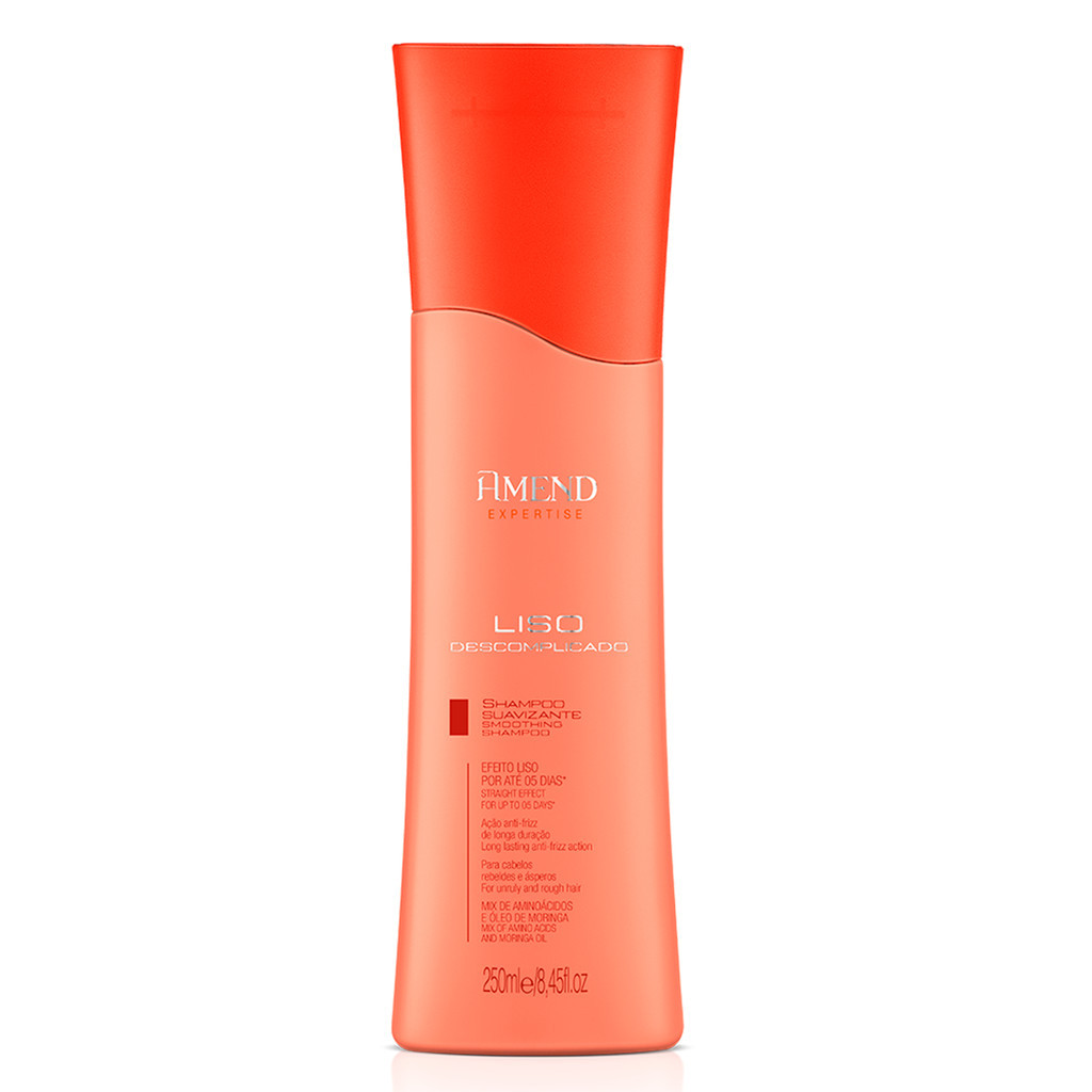CARACTERÍSTICAS CONDICIONADOR SUAVIZANTE AMEND EXPERTISE LISO DESCOMPLICADO 250ML Condicionador Suavizante Amend Expertise Liso Descomplicado: Com fórmula ultra avançada garante até 05 dias* de cabelos lisos (quando usado em conjunto com demais produtos da linha de acordo com o modo de uso). Com ação antifrizz nutre intensivamente o fio rebelde. Prossiga o processo aplicando o Leave-in Suavizante da linha. Dermatologicamente testado SHAMPOO SUAVIZANTE AMEND EXPERTISE LISO DESCOMPLICADO 250ML Shampoo Suavizante Amend Expertise Liso Descomplicado: Possui uma fórmula ultra avançada que garante até 05 dias* de cabelos lisos (quando usado em conjunto com demais produtos da linha). Com ação antifrizz, nutre intensivamente o fio rebelde. Dermatologicamente testado. MÁSCARA SUAVIZANTE AMEND EXPERTISE LISO DESCOMPLICADO 300G Máscara Suavizante Amend Expertise Liso Descomplicado: Repara, restaura e hidrata a fibra capilar. Com fórmula ultra avançada que intensifica o efeito liso (quando usado em conjunto com demais produtos da linha de acordo com o modo de uso). Possui ação antifrizz e nutre profundamente o fio rebelde deixando os cabelos macios e suaves ao toque, eliminando o aspecto áspero do fio. COMO USAR CONDICIONADOR SUAVIZANTE AMEND EXPERTISE LISO DESCOMPLICADO 250ML Aplicar após o shampoo nos cabelos molhados. Massageie os fios suavemente e enxágue. Para alcançar o resultado perfeito, aplicar o shampoo + condicionador + leave -in conforme modo de uso indicado na embalagem. SHAMPOO SUAVIZANTE AMEND EXPERTISE LISO DESCOMPLICADO 250ML Aplique nos cabelos molhados, massageando suavemente com as pontas dos dedos. Enxágue e repita a operação. Para alcançar o resultado perfeito, aplicar o condicionador e o leave-in da linha Amend Liso Descomplicado conforme modo de uso indicado na embalagem. MÁSCARA SUAVIZANTE AMEND EXPERTISE LISO DESCOMPLICADO 300G Após lavar os cabelos com o shampoo, retire o excesso de água com uma toalha, aplique a máscara do comprimento dos fios até as pontas, massageando mecha por mecha. Deixe agir por 05 minutos. Enxágue bem.